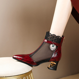 Модные женские сетчатые сапоги на среднем каблуке с кружевом и стразами, весенние новые кожаные короткие сапоги с острым носком и толстым каблуком, летние полые сандалии