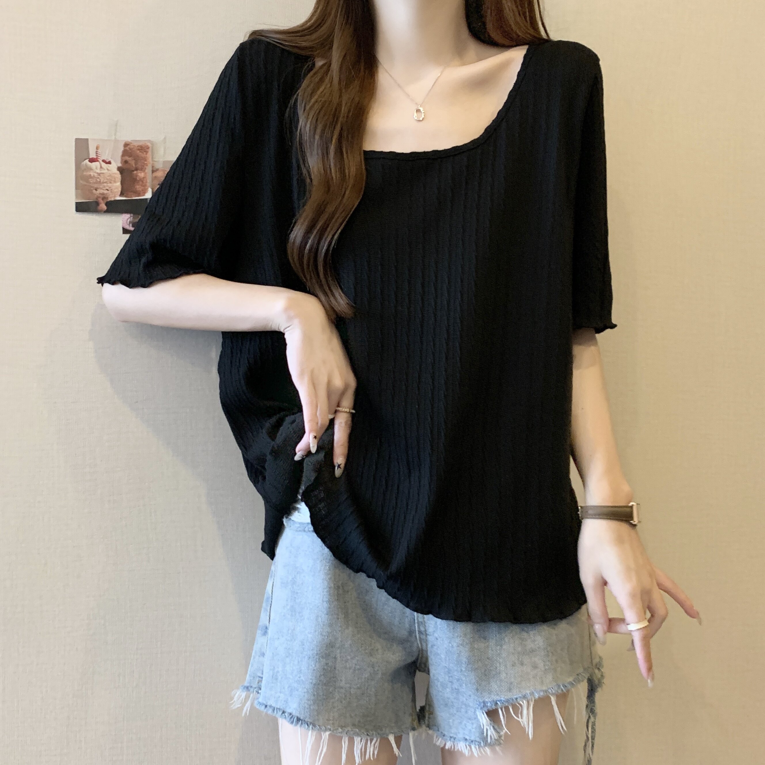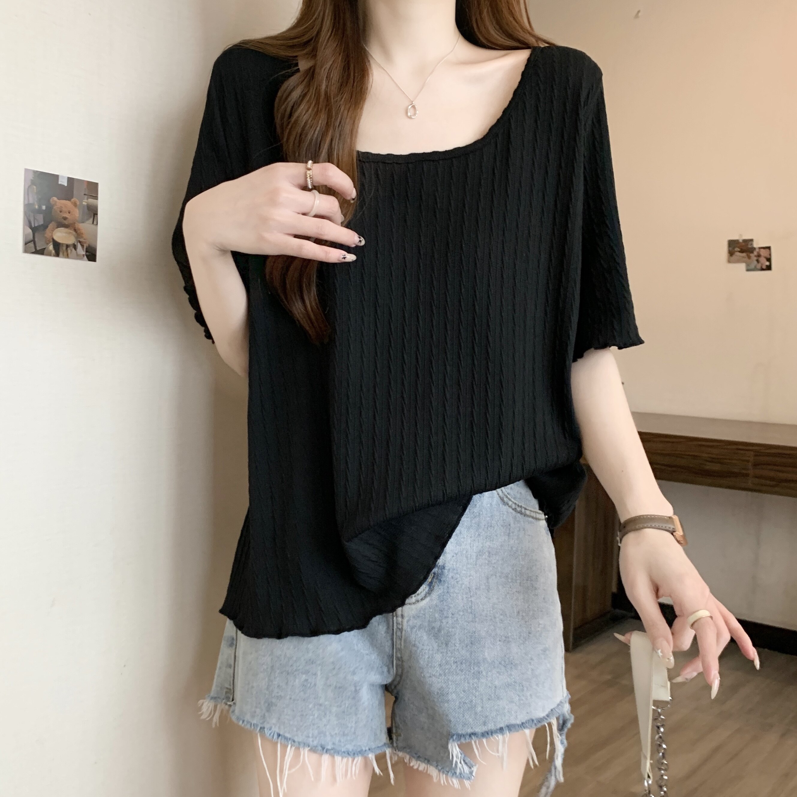 Черная летняя дизайнерская футболка, большой размер, свободный крой, тренд сезона, квадратный вырез