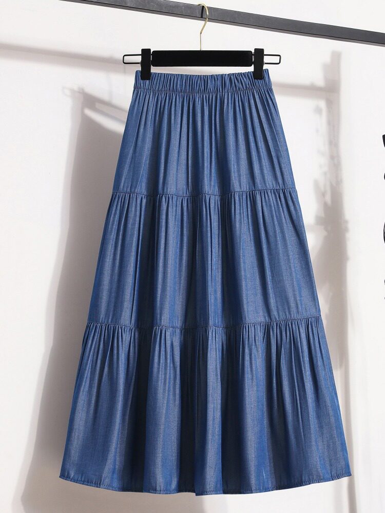 Тонкая джинсовая летняя приталенная длинная юбка, большой размер, высокая талия, А-силуэт