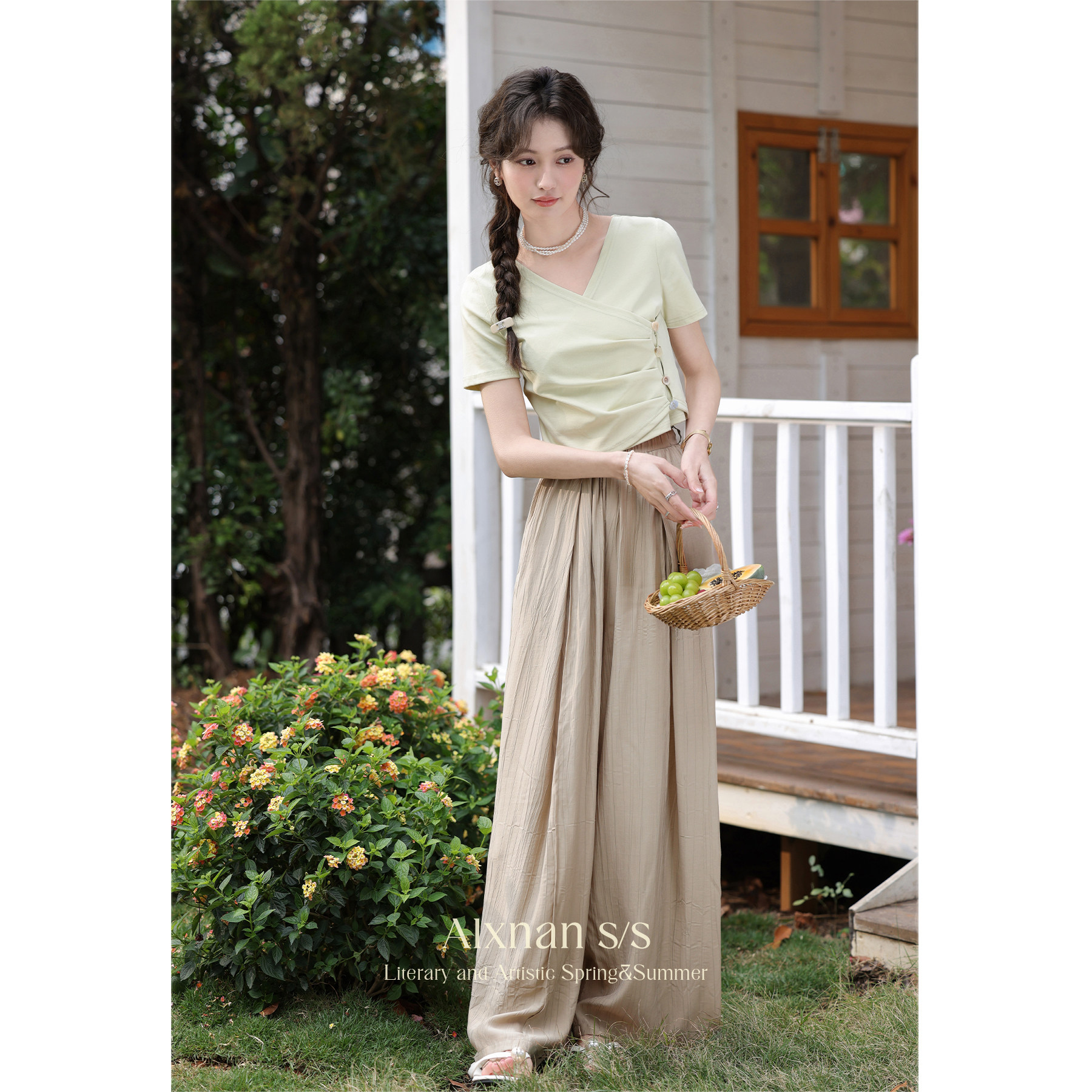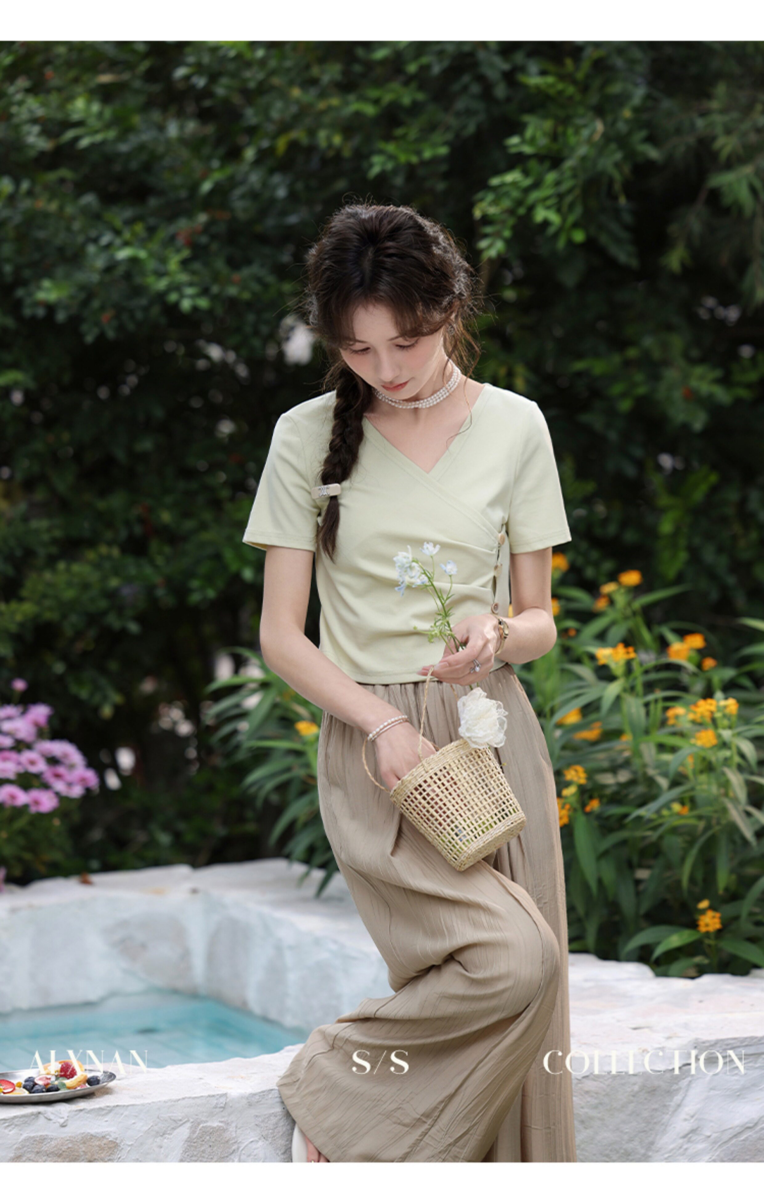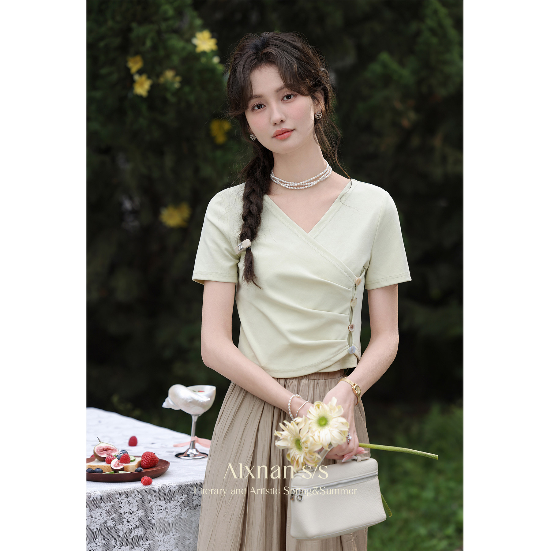 鹿向南 Короткая летняя футболка с коротким рукавом, V-образный вырез
