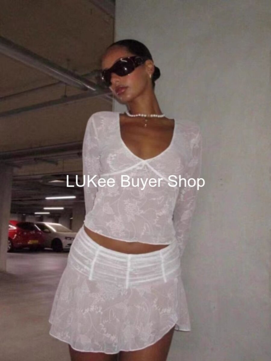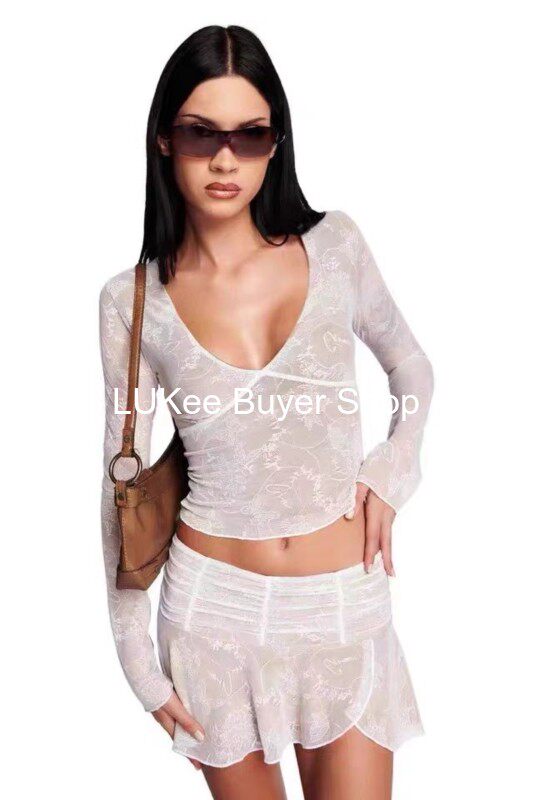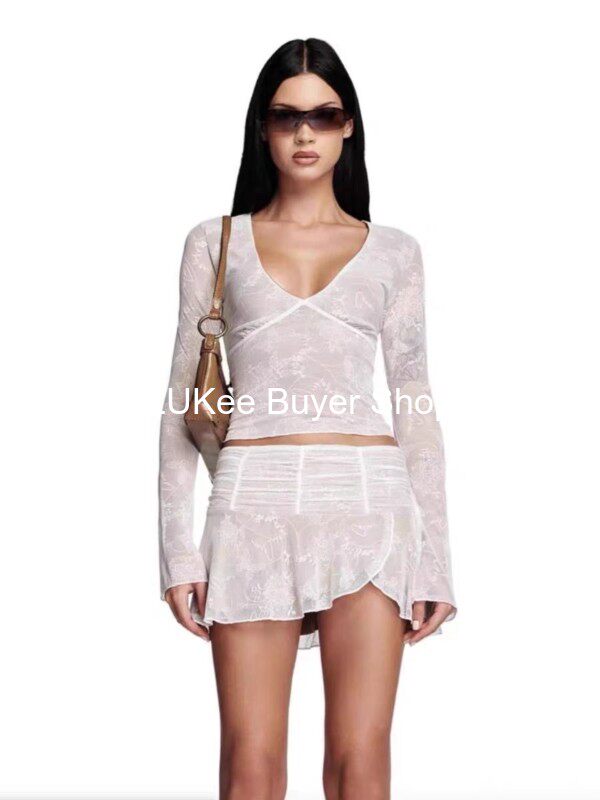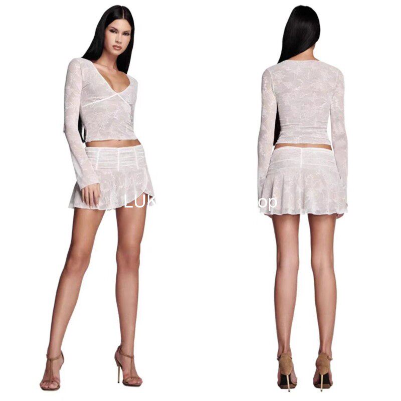 Кружевной сексуальный лонгслив, мини-юбка, комплект, французский стиль, яркий броский стиль