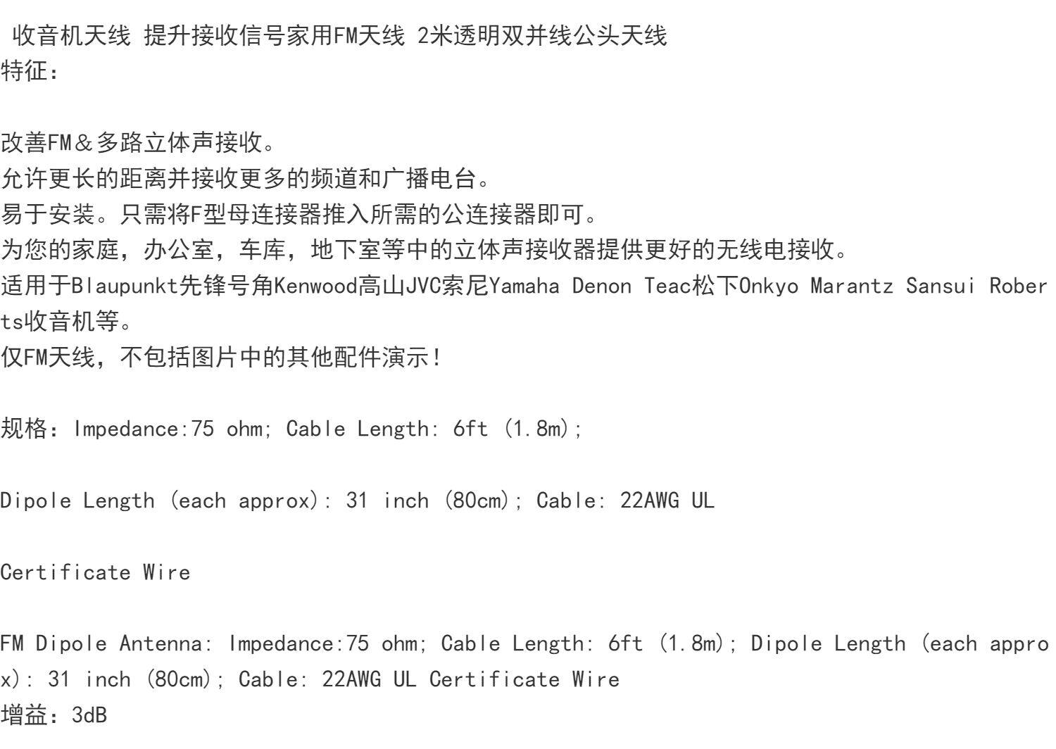 2M75OHMFM RadioAerialCable для улучшения полученного сигнала Home FM антенна 2 метра прозрачная