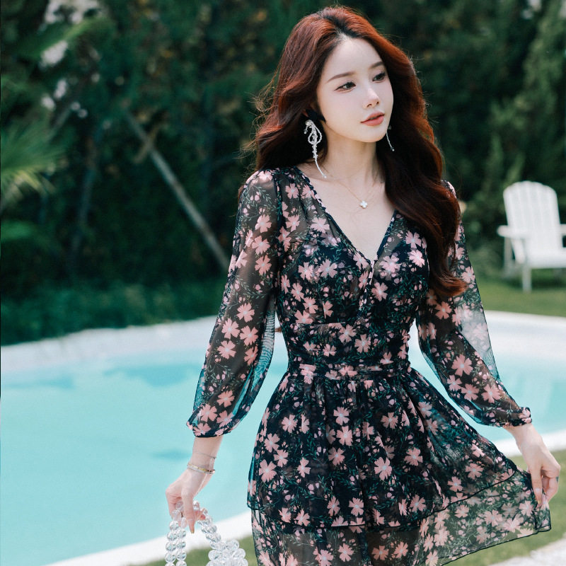2024 Новый купальник, женский цельный купальник в стиле юбки с длинными рукавами, солнцезащитный крем, закрывающий талию, для похудения, красочный купальник на курорте горячих источников