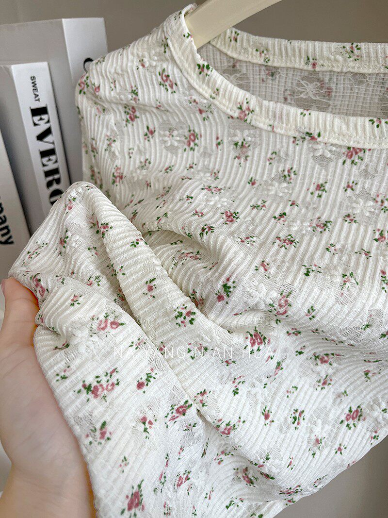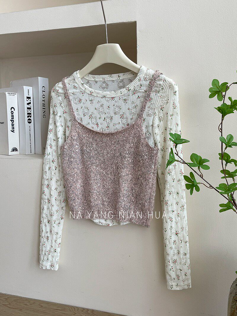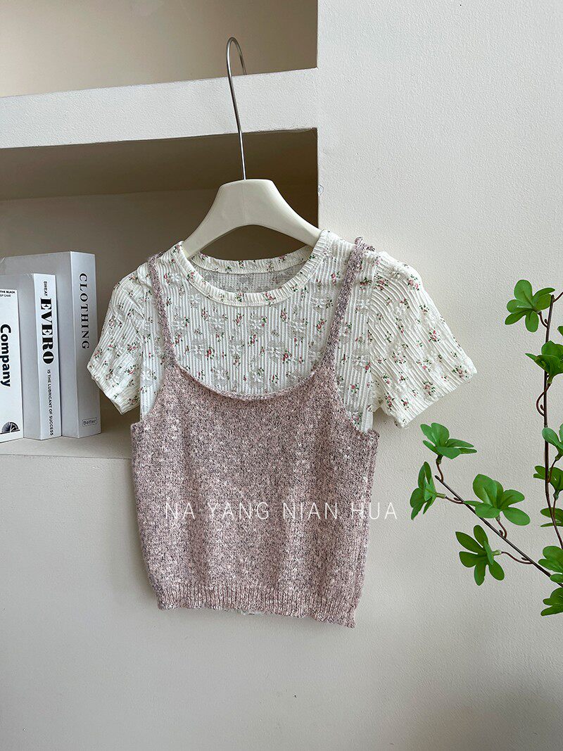 Трикотажная майка, топ с чашечками, милый кружевной базовый комплект, цветочный принт