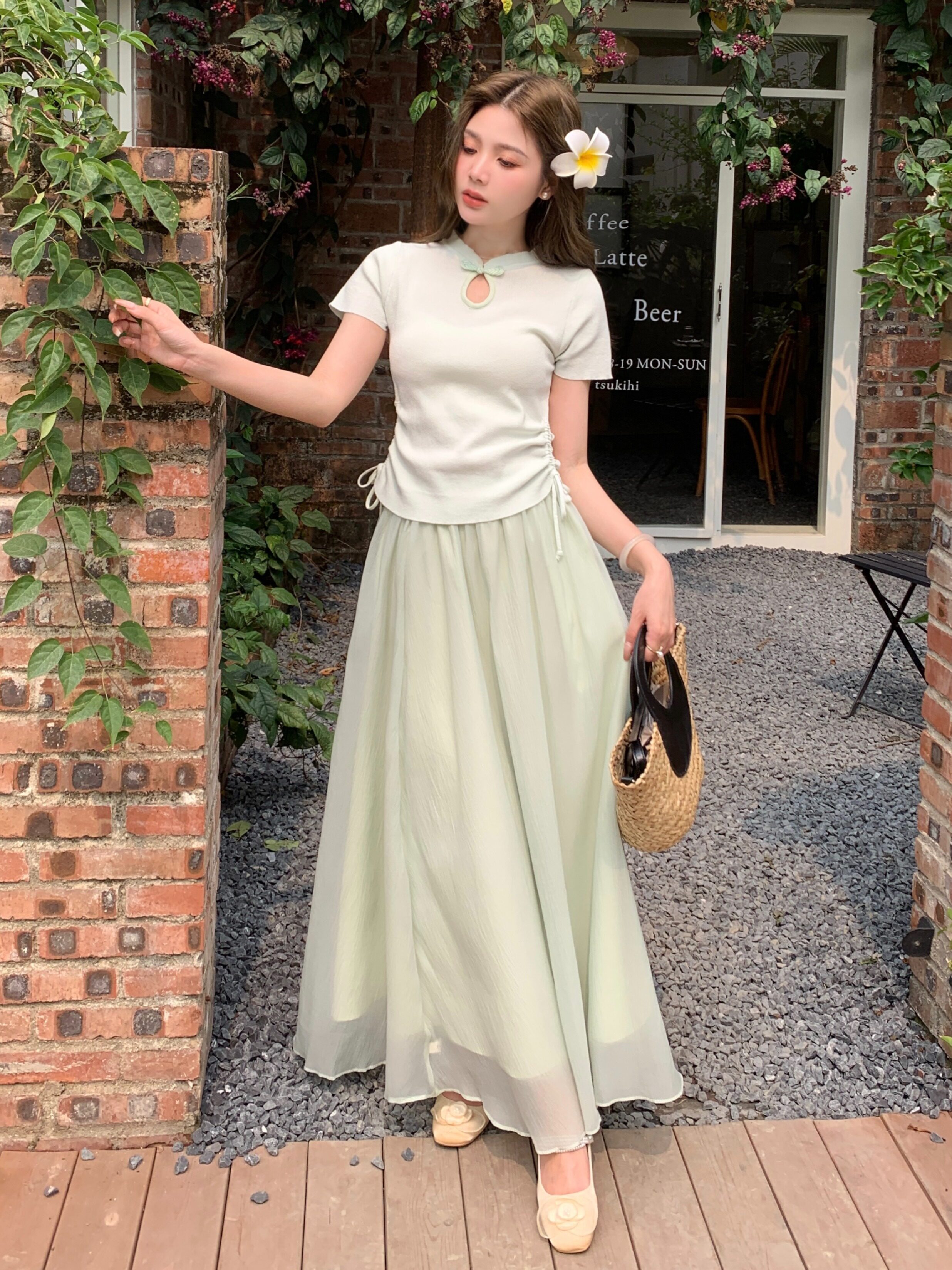 | Цвет: | Зеленый топ, Зеленая юбка, Черный топ, Абрикосовая юбка |