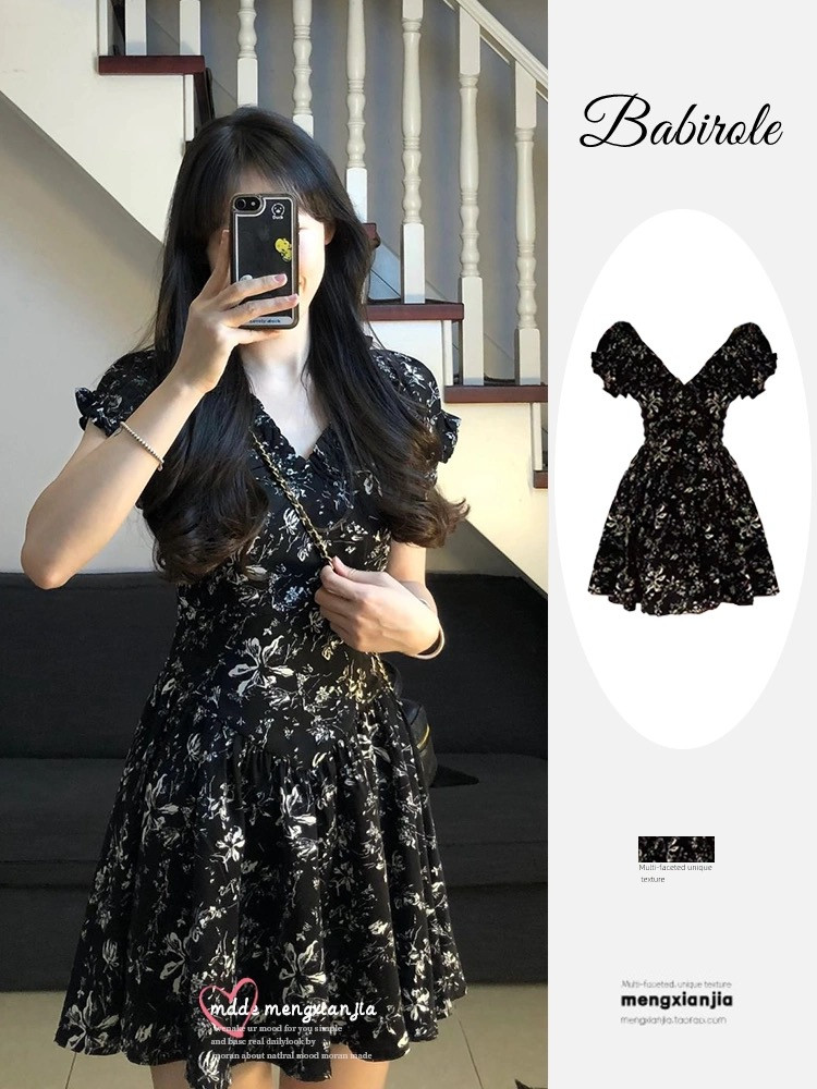 Сексуальная мини-юбка, приталенный корсет, платье, изысканный стиль, А-силуэт, V-образный вырез, рукава фонарики, в цветочек