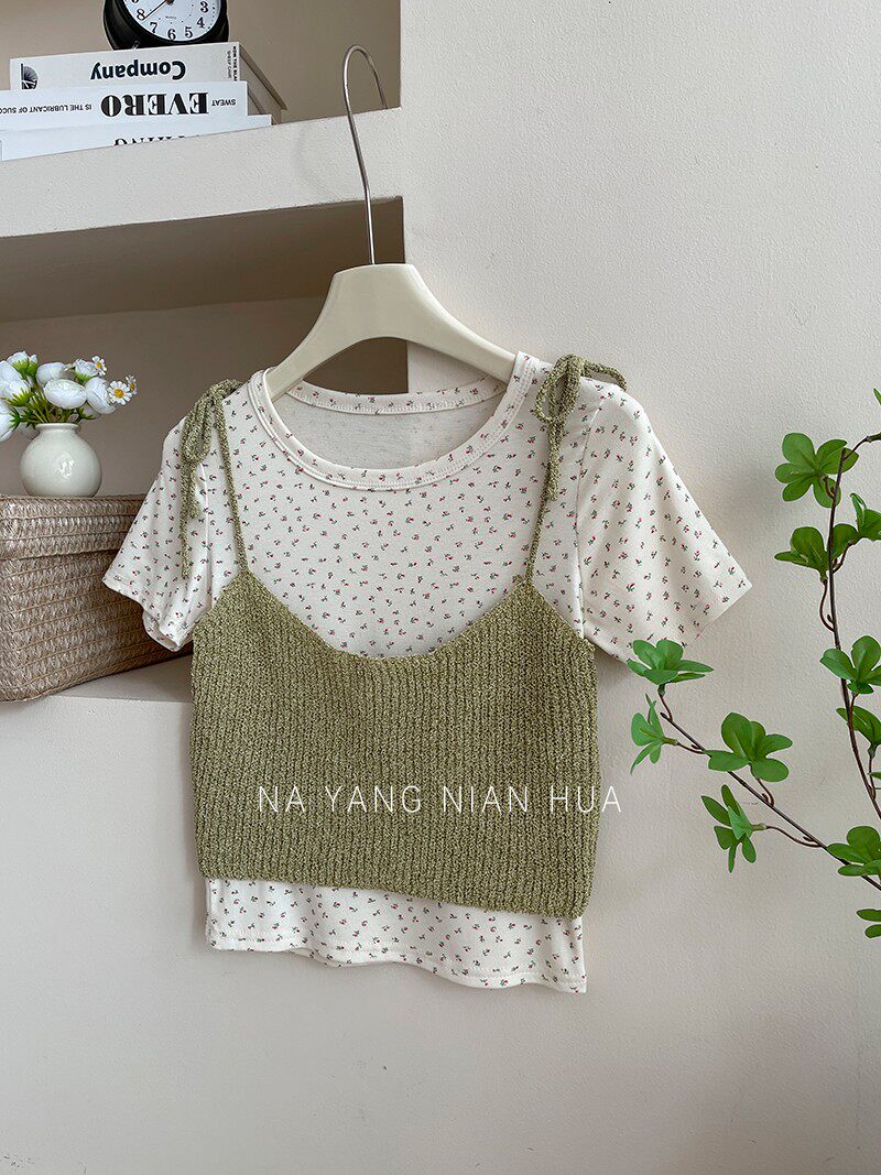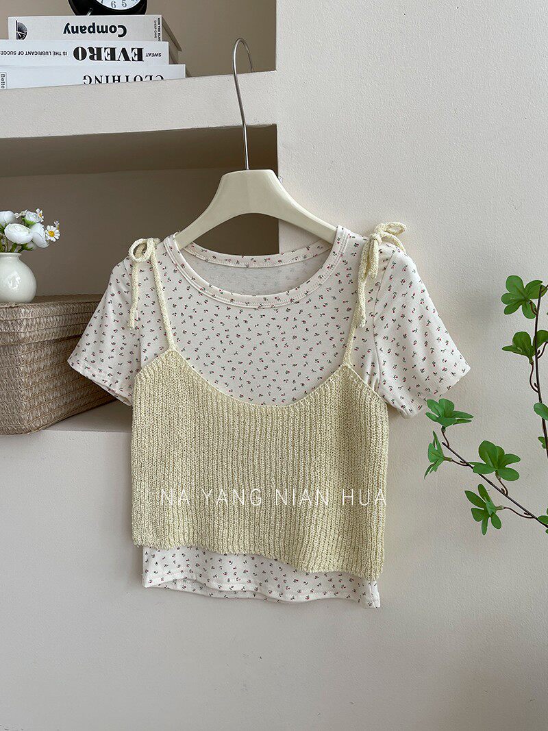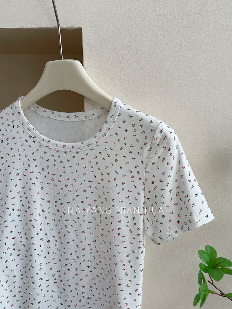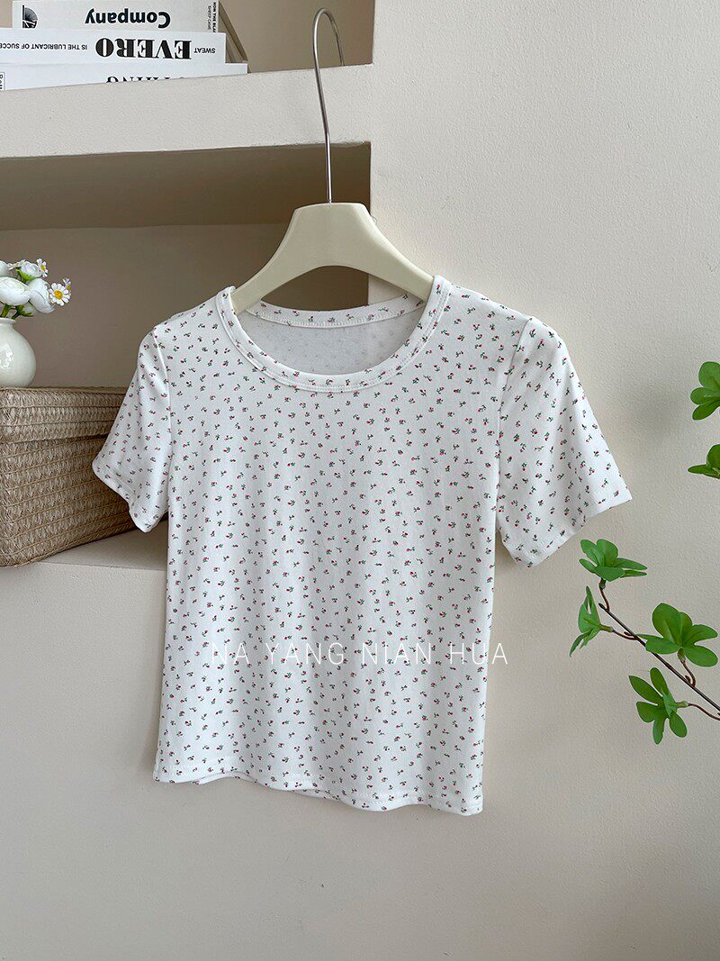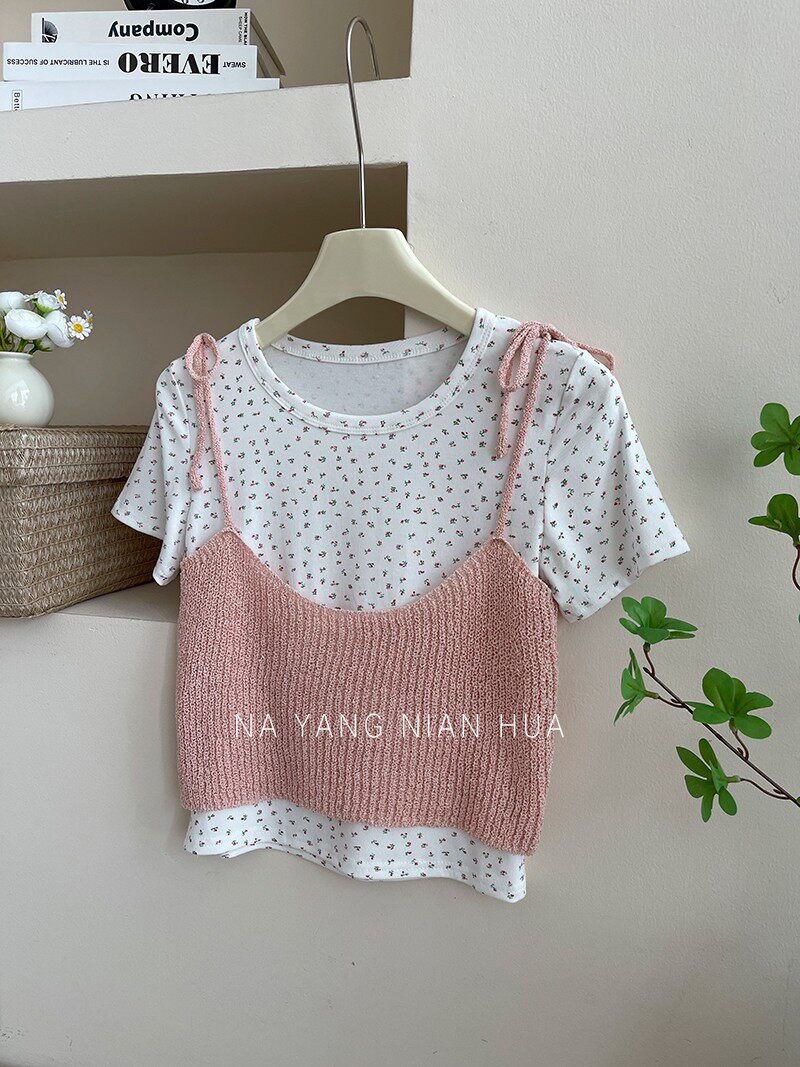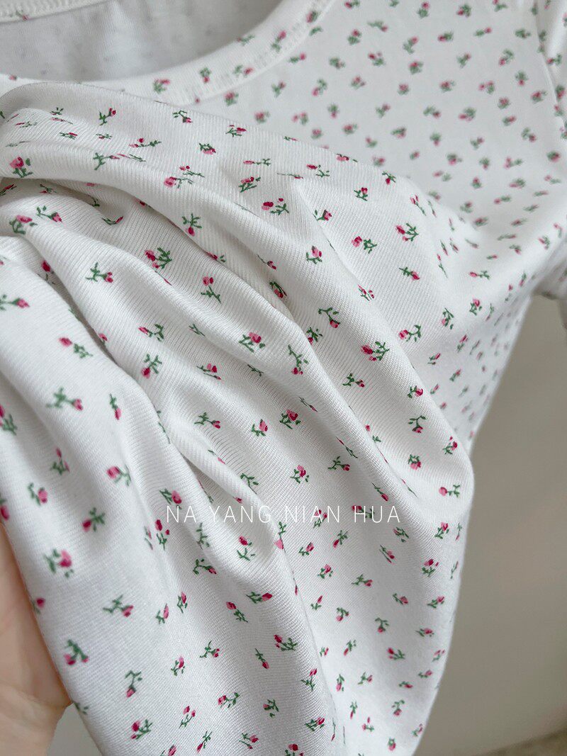 Милый трикотажный топ с чашечками, комплект, футболка, для маленькой груди, цветочный принт