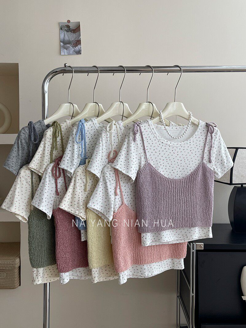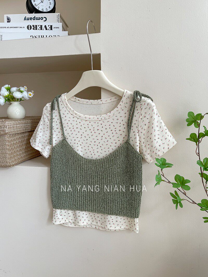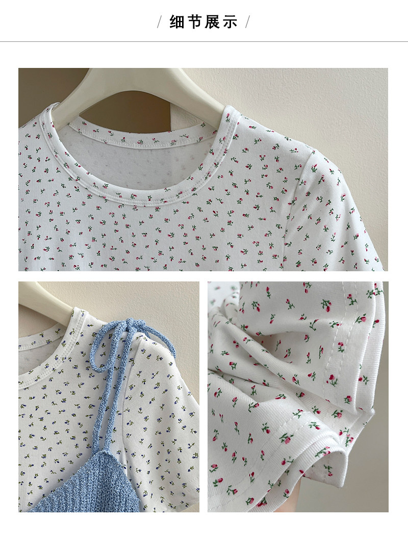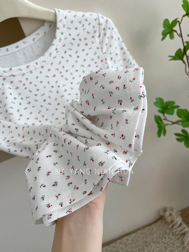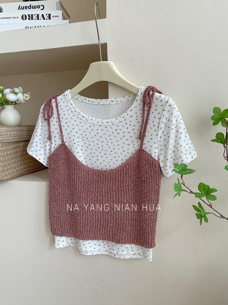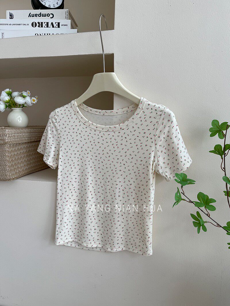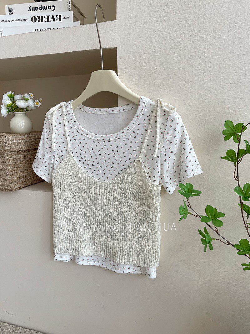 Милый трикотажный топ с чашечками, комплект, футболка, для маленькой груди, цветочный принт
