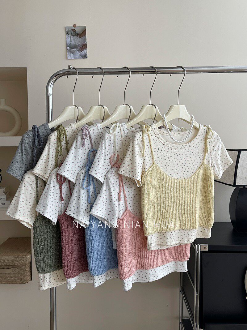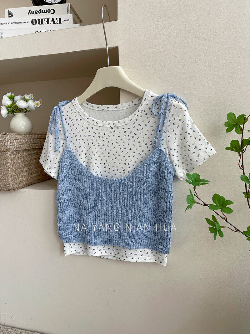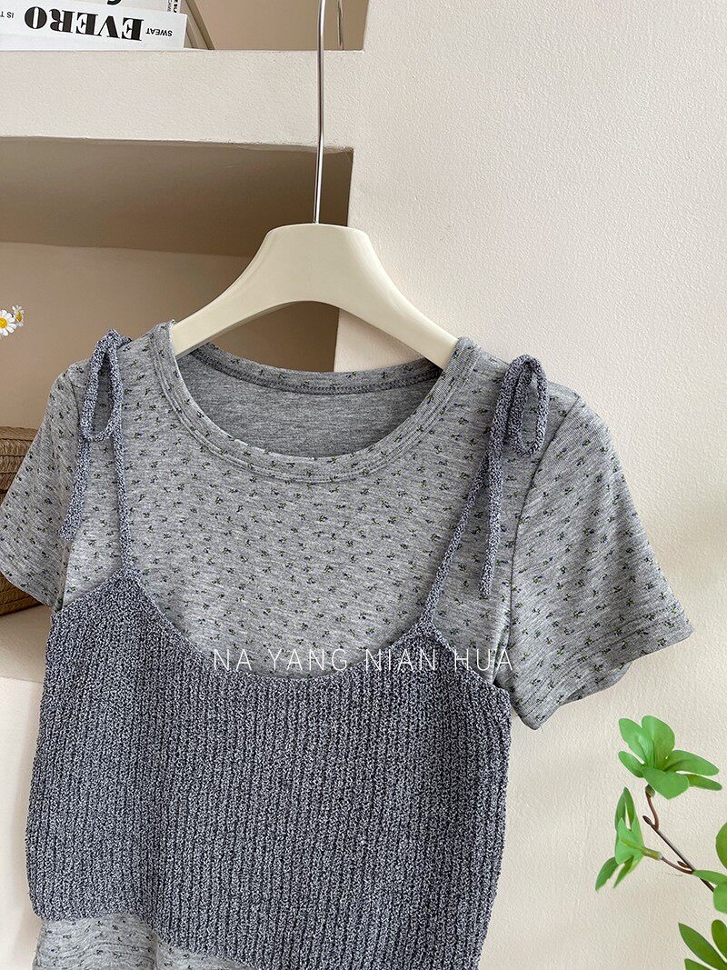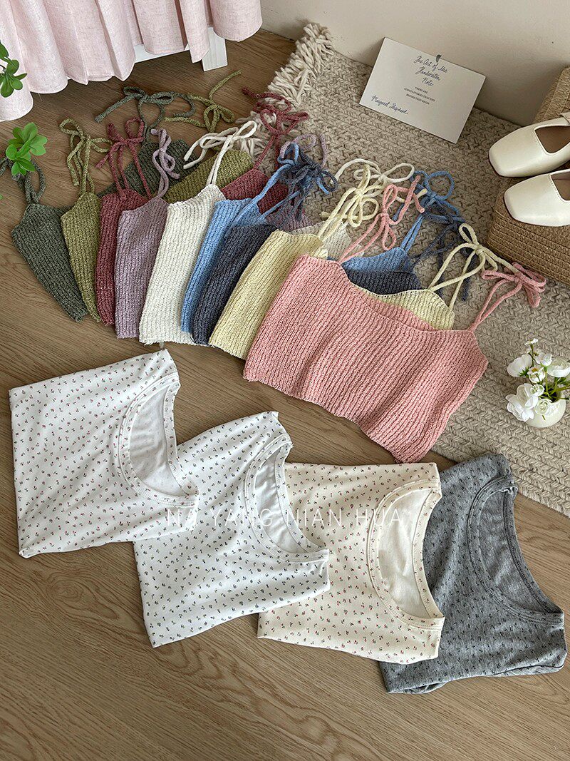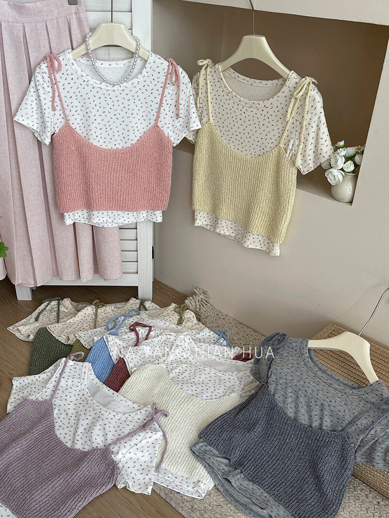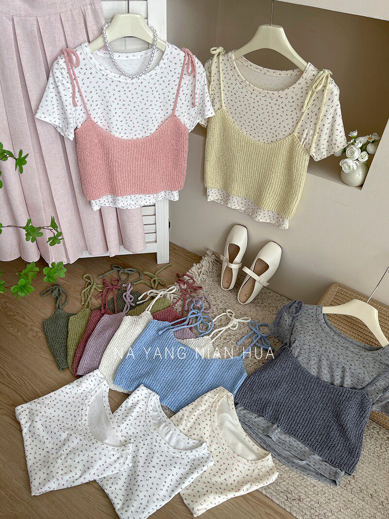 Милый трикотажный топ с чашечками, комплект, футболка, для маленькой груди, цветочный принт