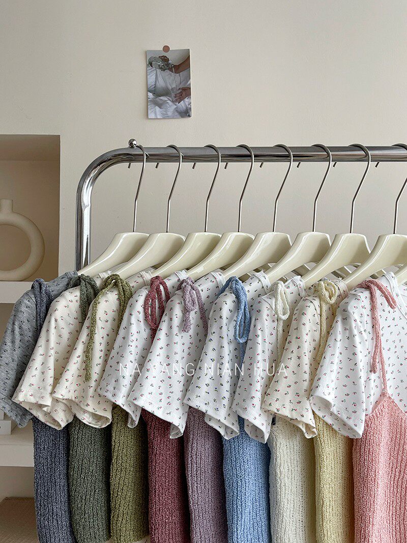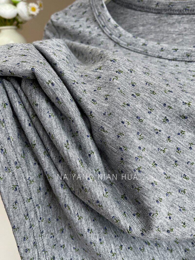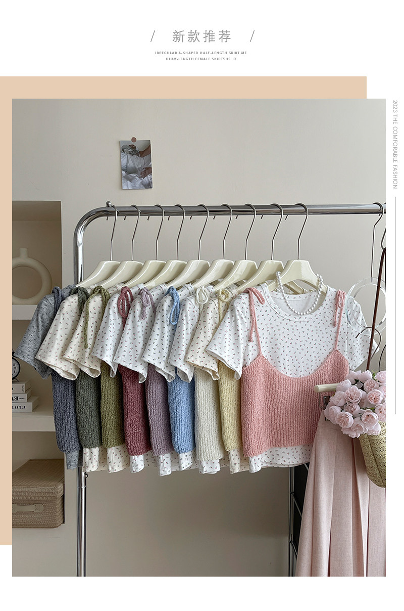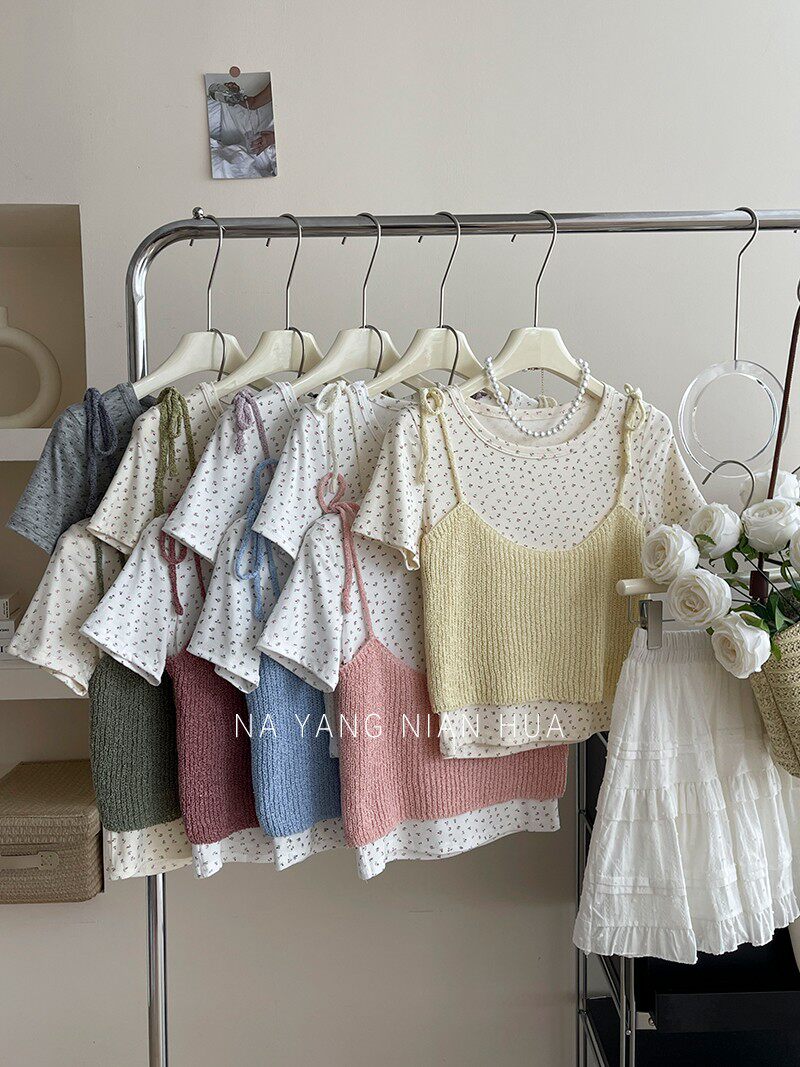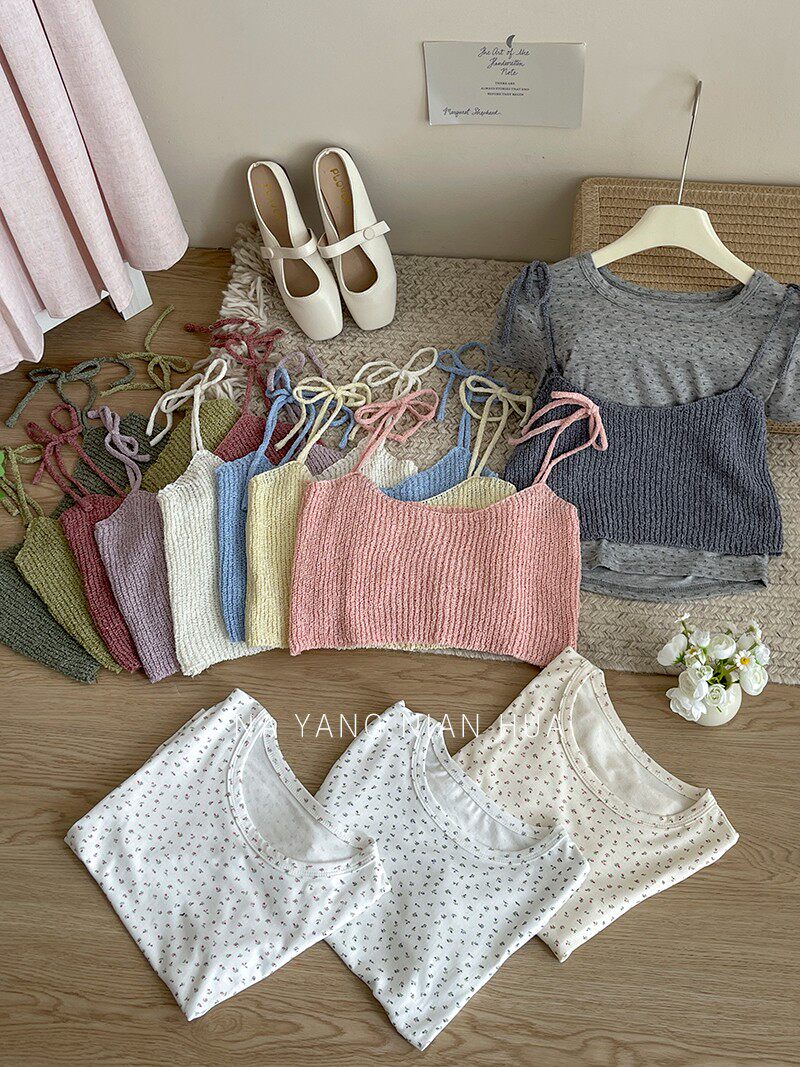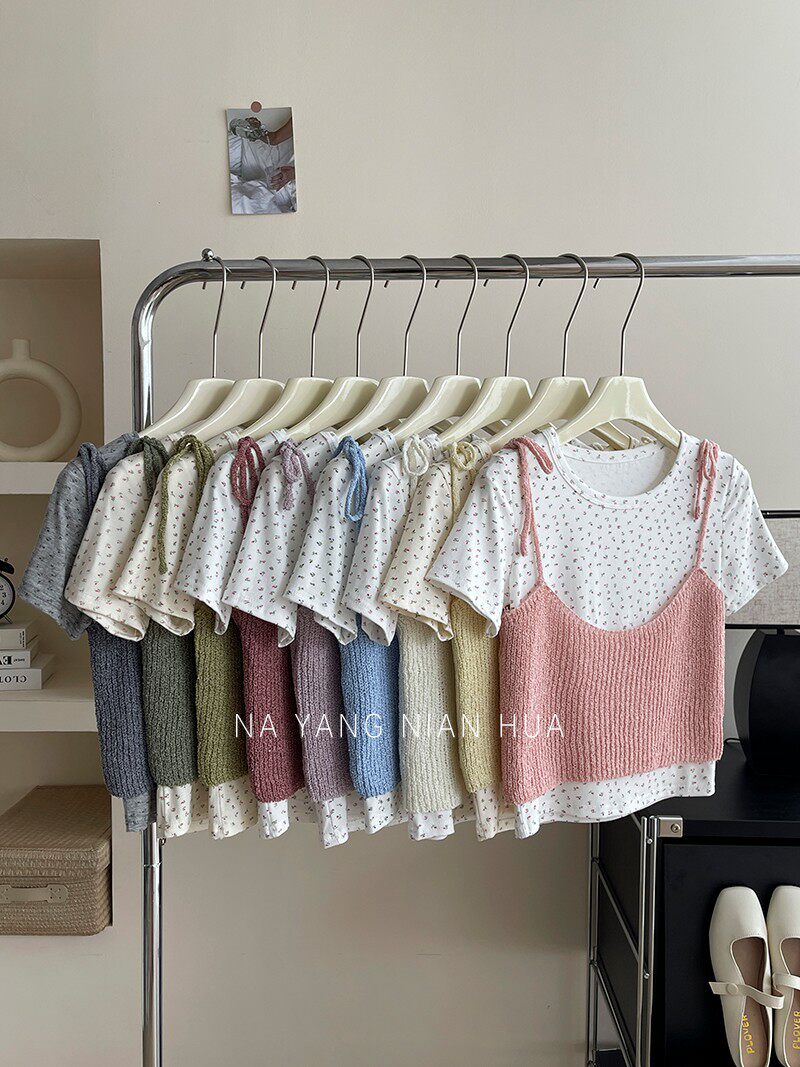 Милый трикотажный топ с чашечками, комплект, футболка, для маленькой груди, цветочный принт