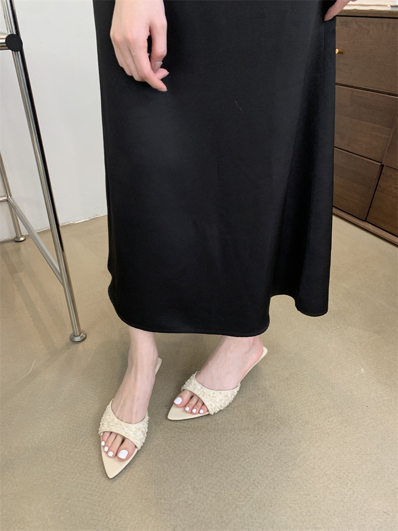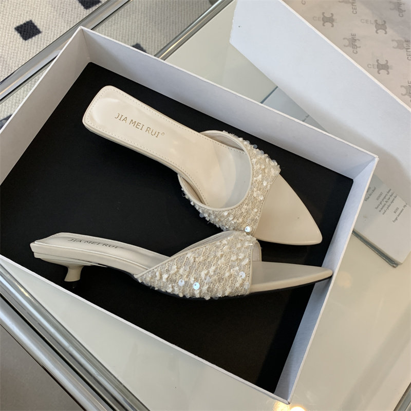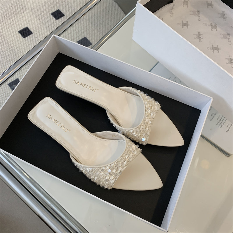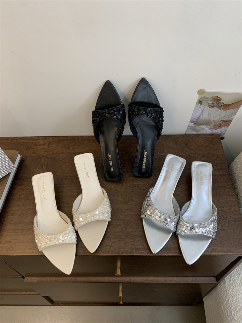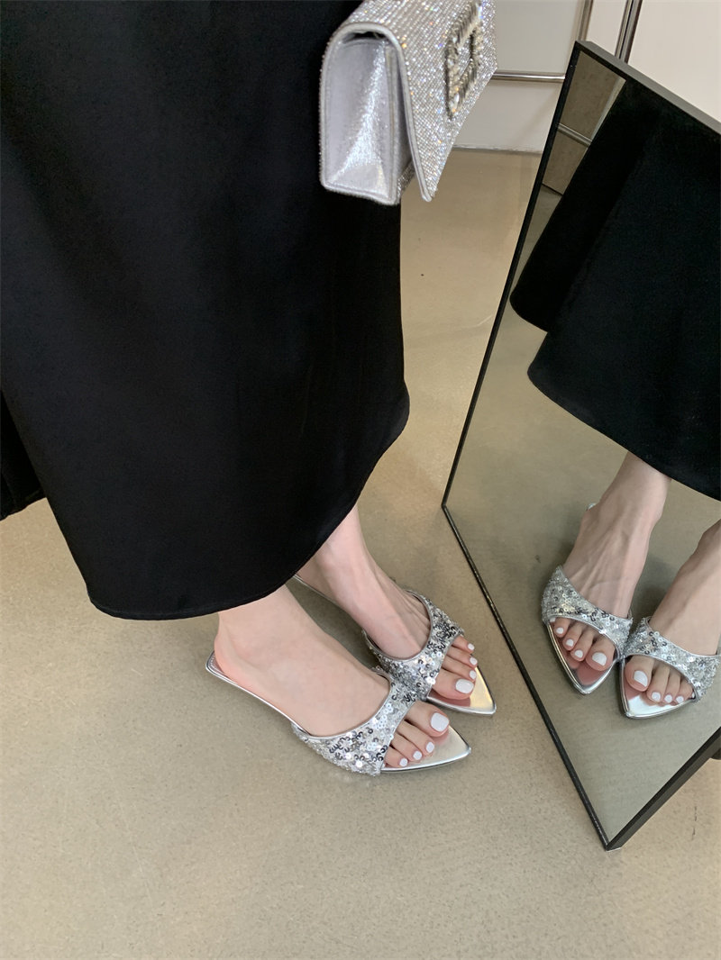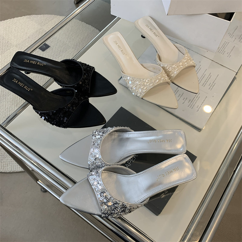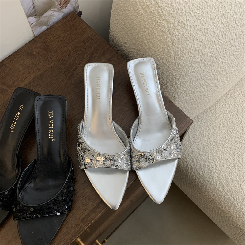 Тапочки, модная черная обувь с заостренным носом, пляжные слайдеры, блестки для ногтей на высоком каблуке, серебряные сандалии, новая коллекция
