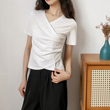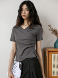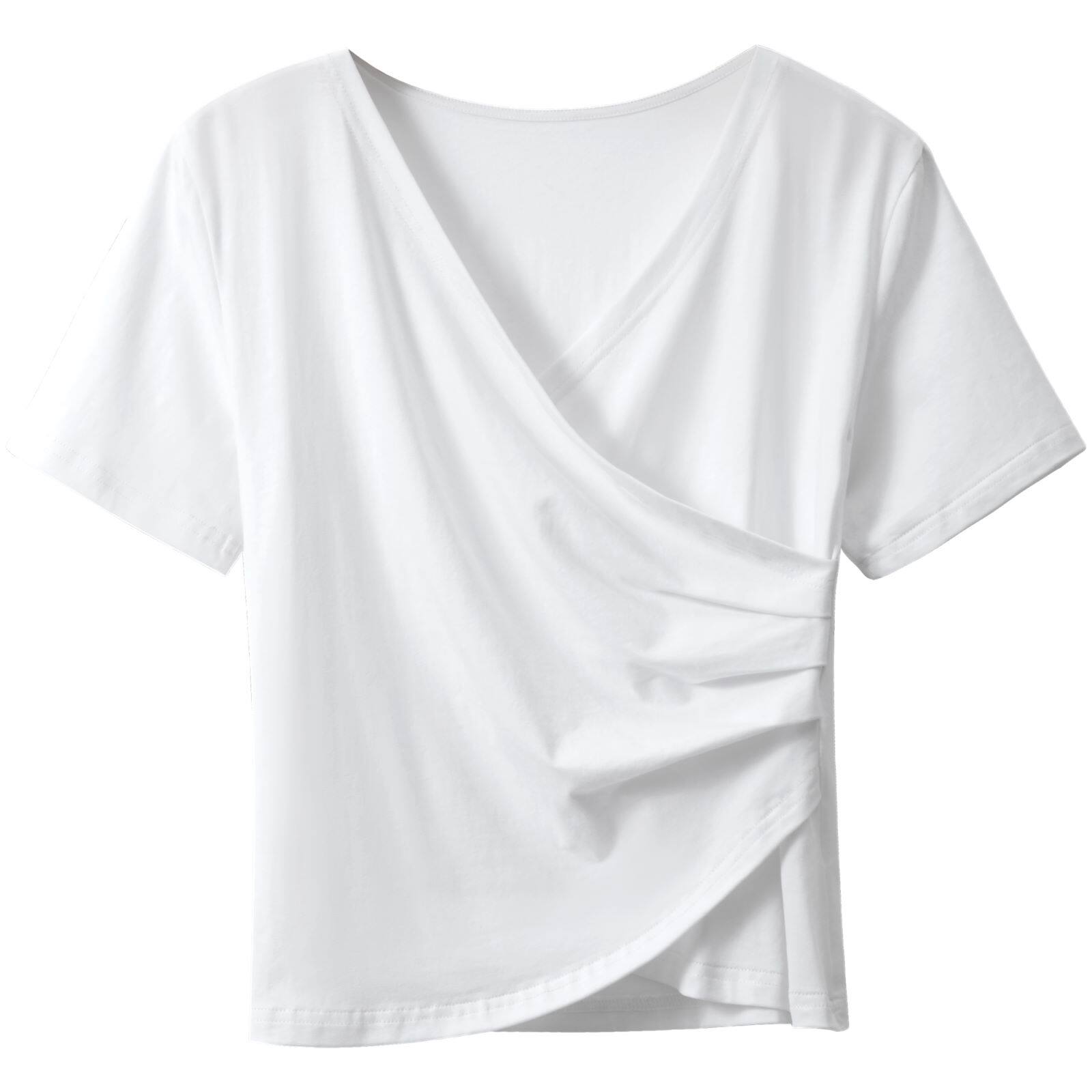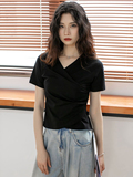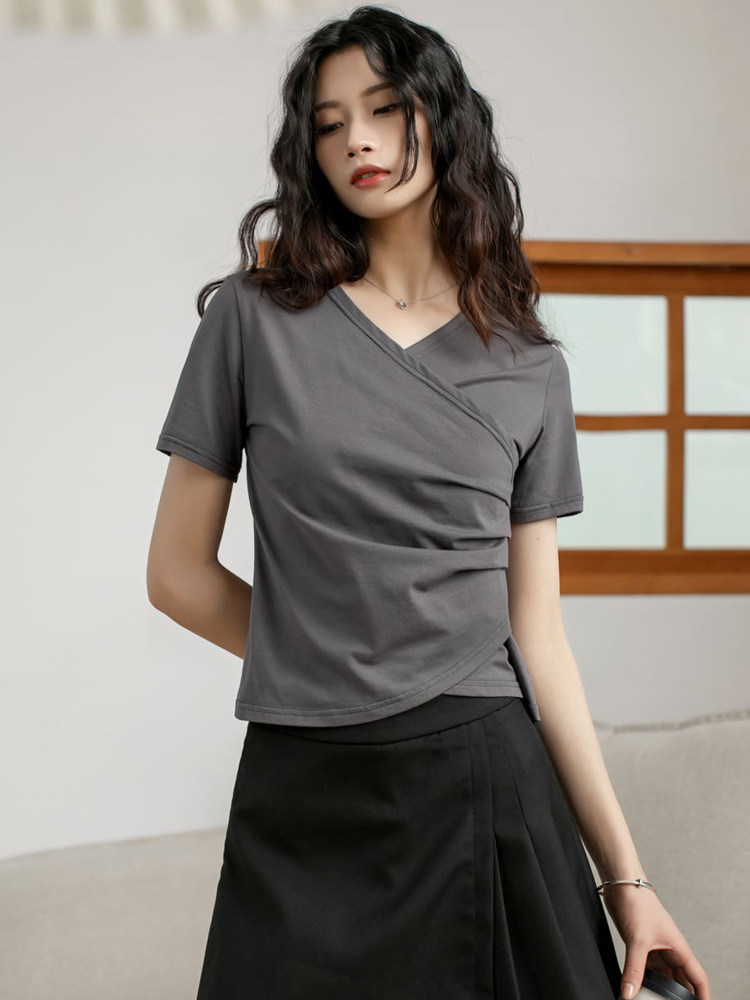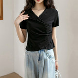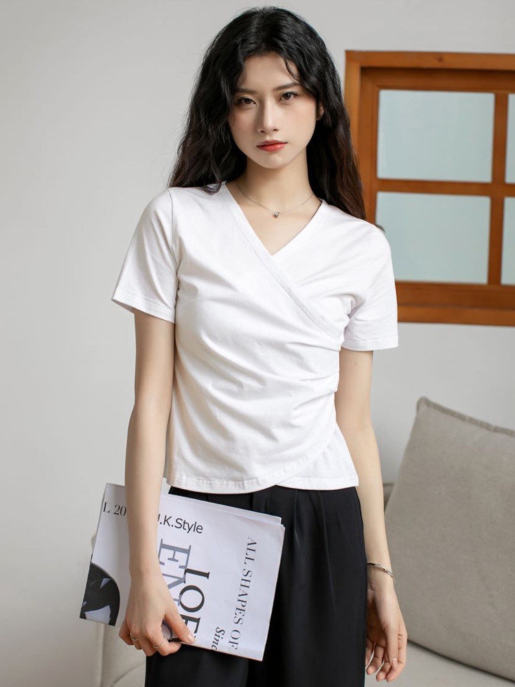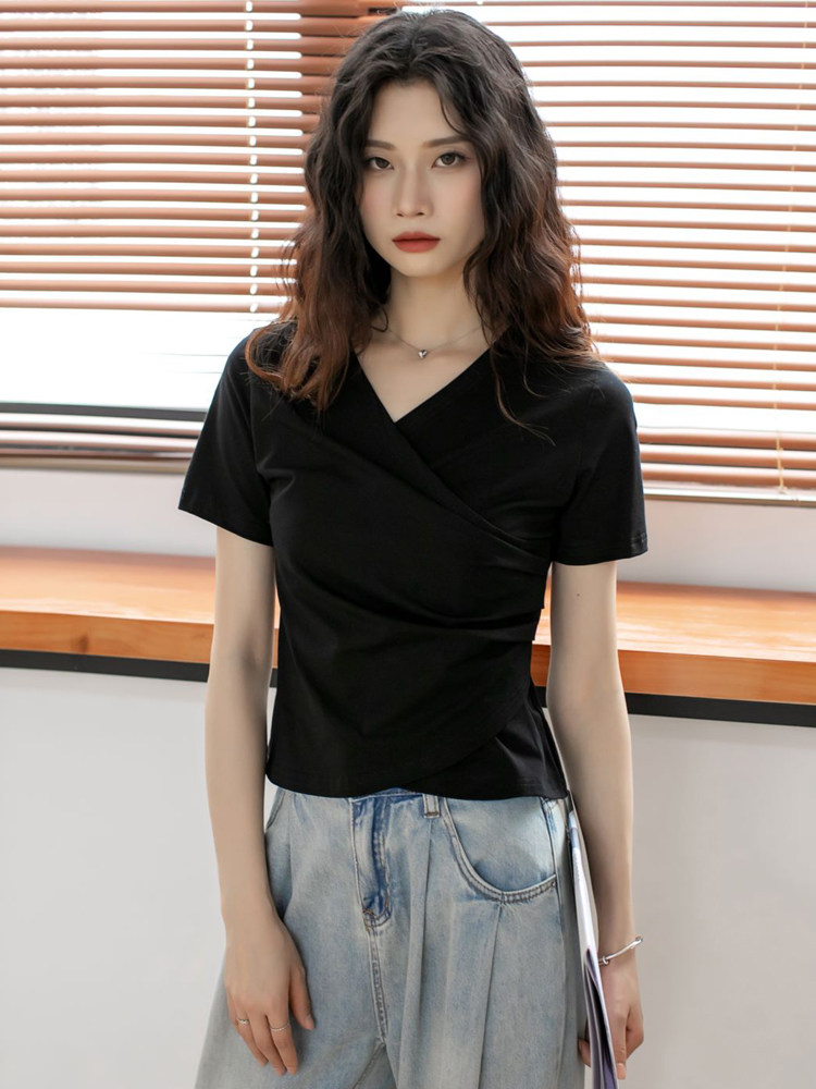 Летняя приталенная дизайнерская короткая футболка с коротким рукавом, большой размер, тренд сезона, V-образный вырез