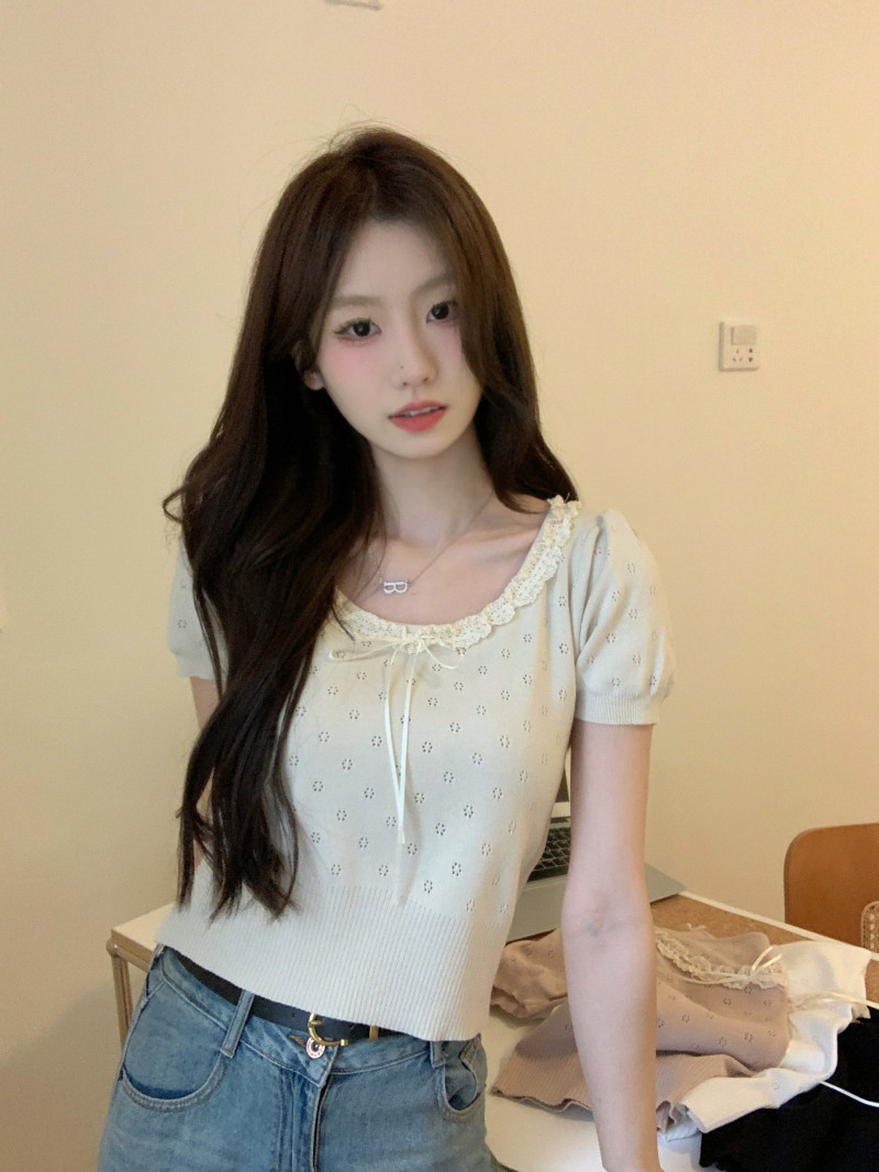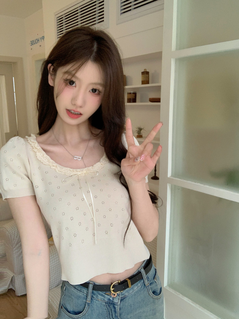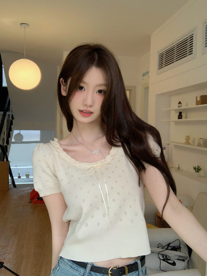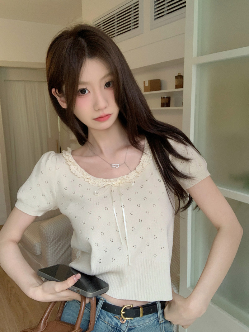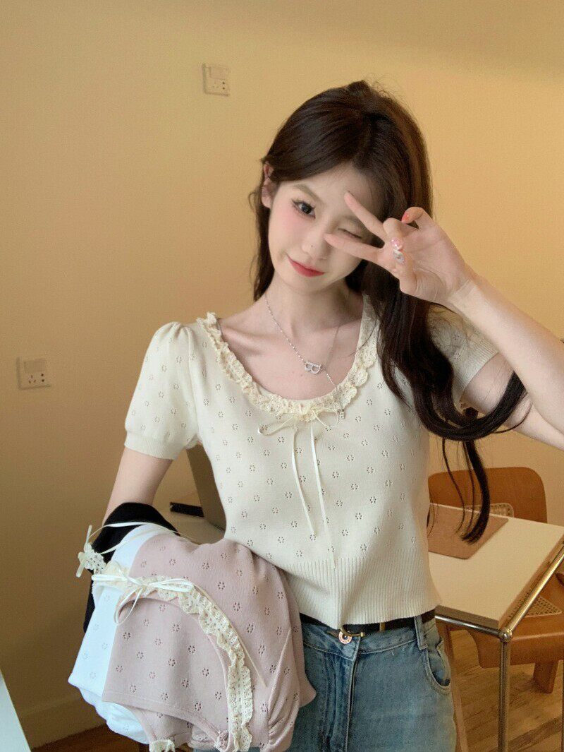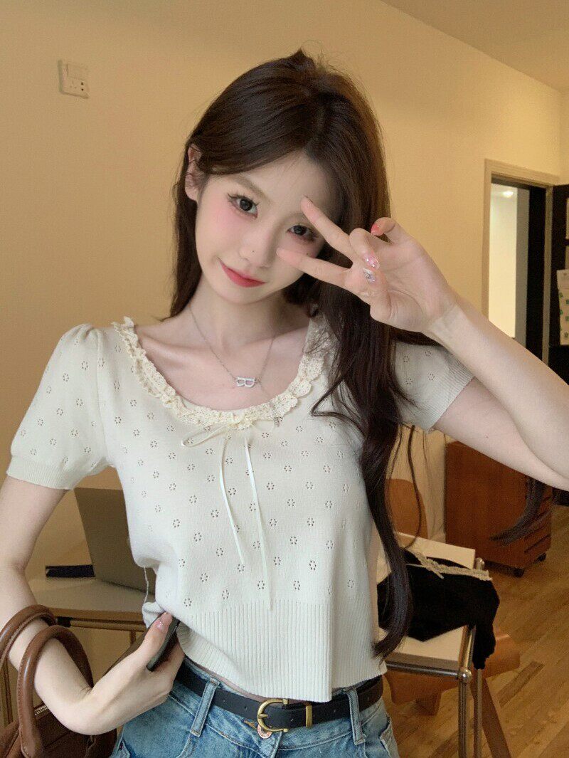 Кружевной трикотажный летний свитер, дизайнерская короткая футболка, короткий рукав, тренд сезона