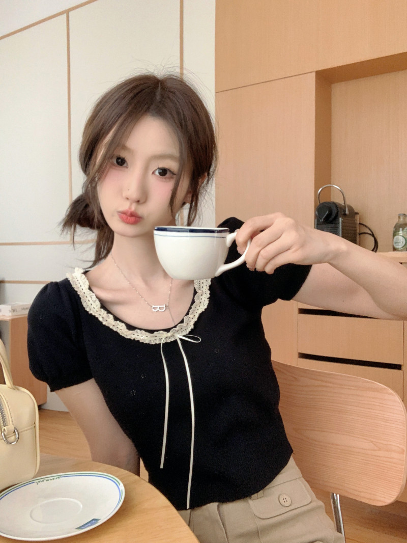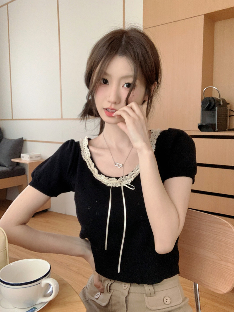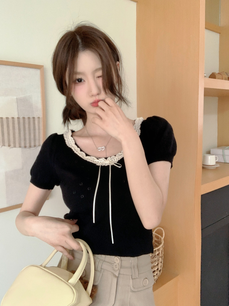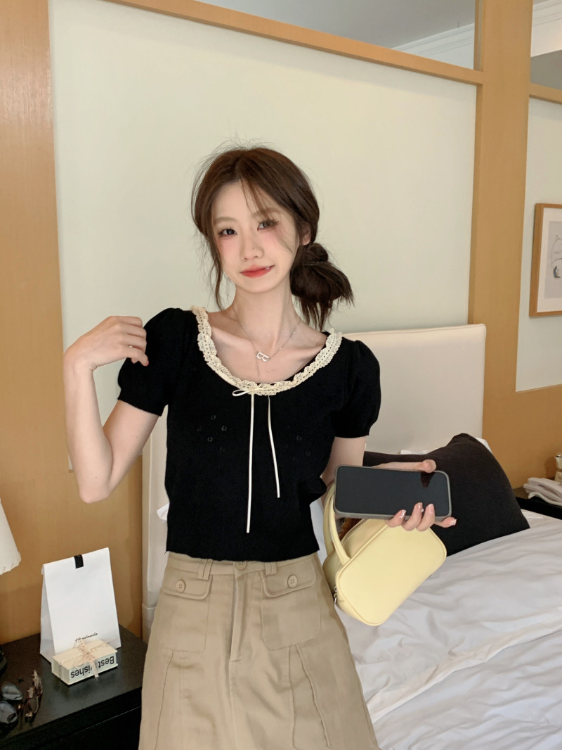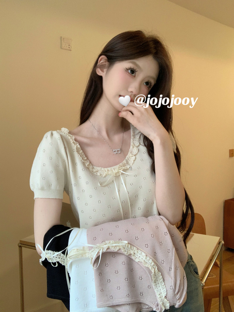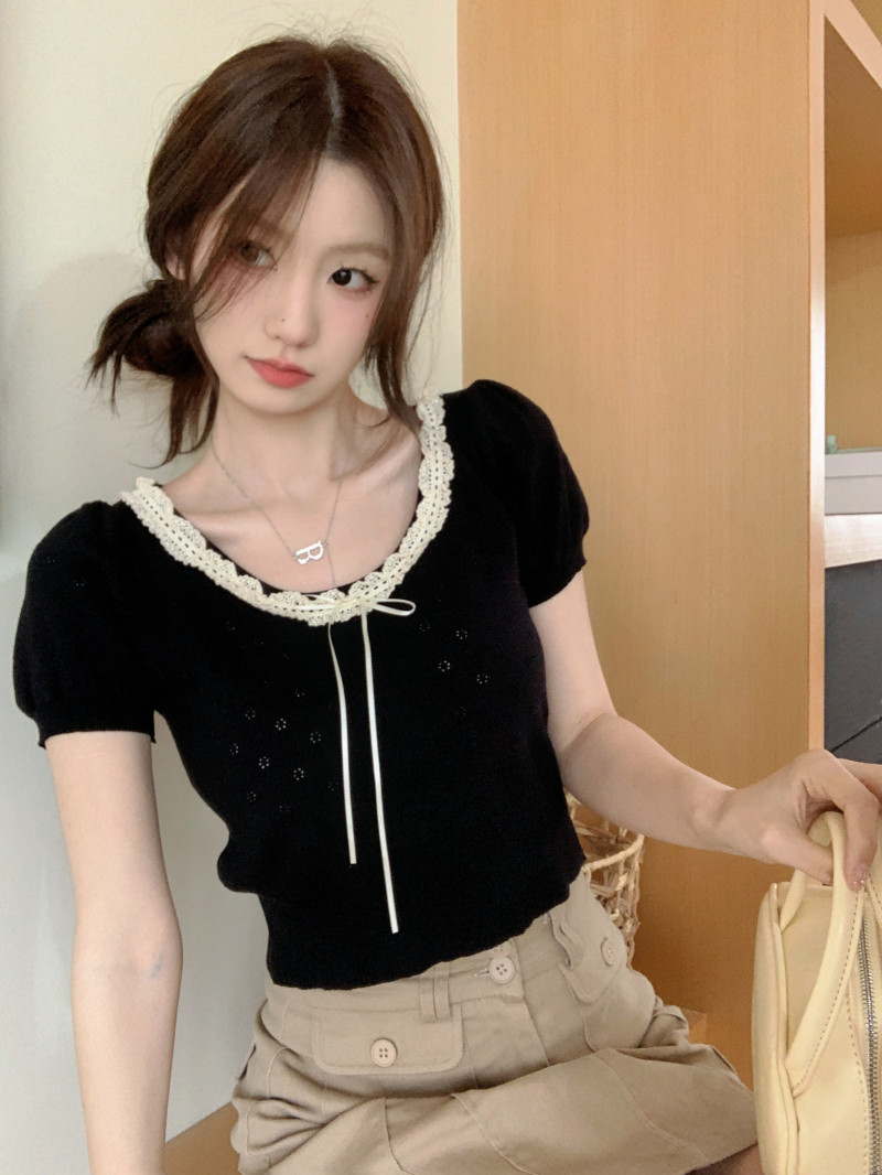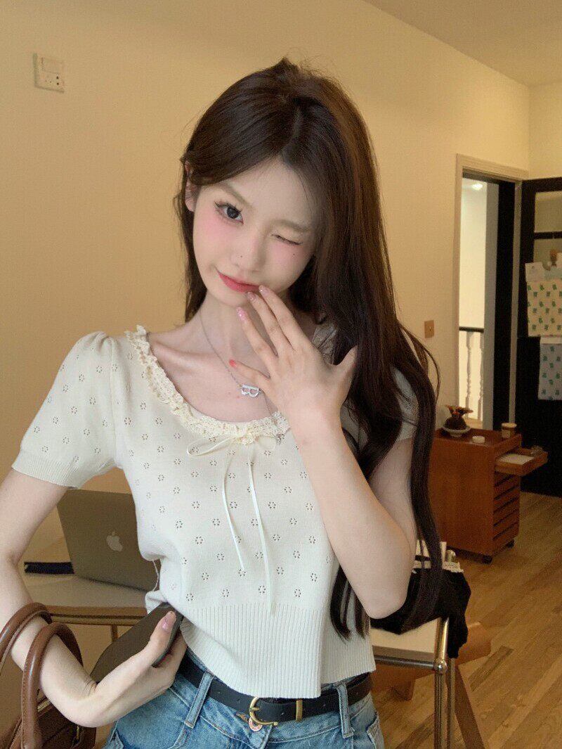 Кружевной трикотажный летний свитер, дизайнерская короткая футболка, короткий рукав, тренд сезона