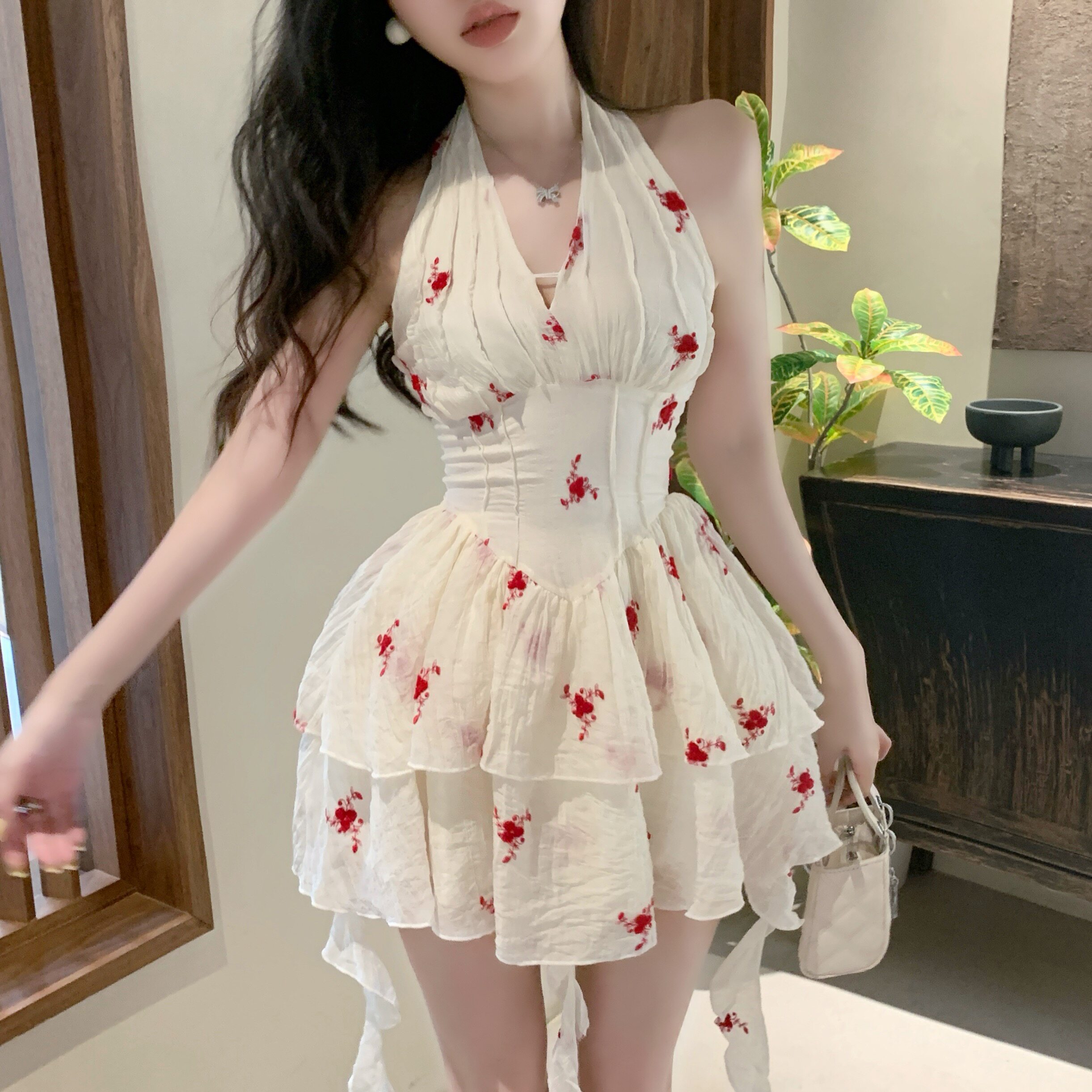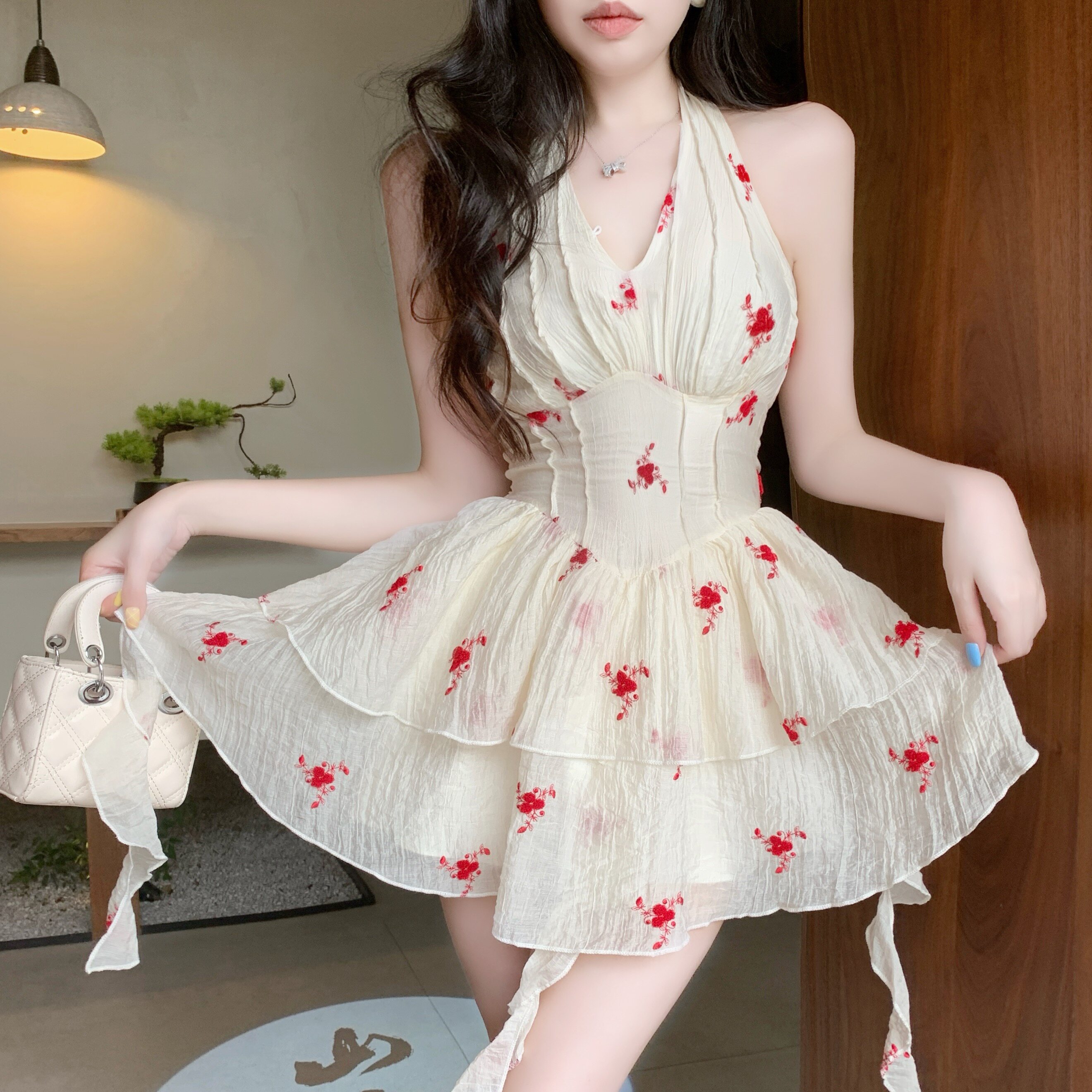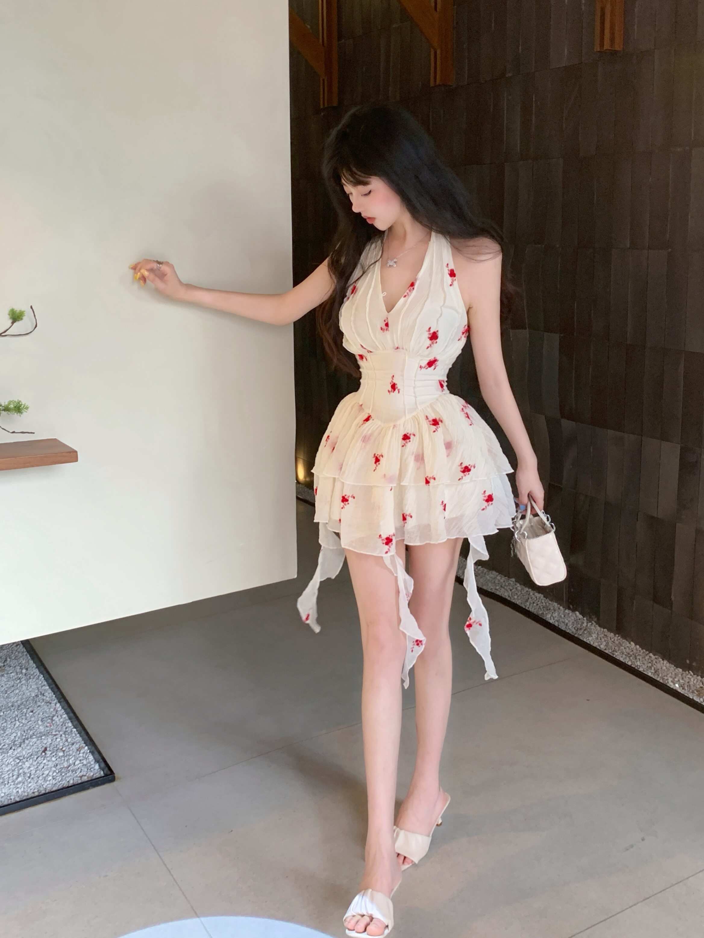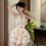 Красивое летнее французское платье с V-образным вырезом и V-образным вырезом для женщин с нежной и чистой юбкой-пачкой в западном стиле с цветочным принтом Platycodon