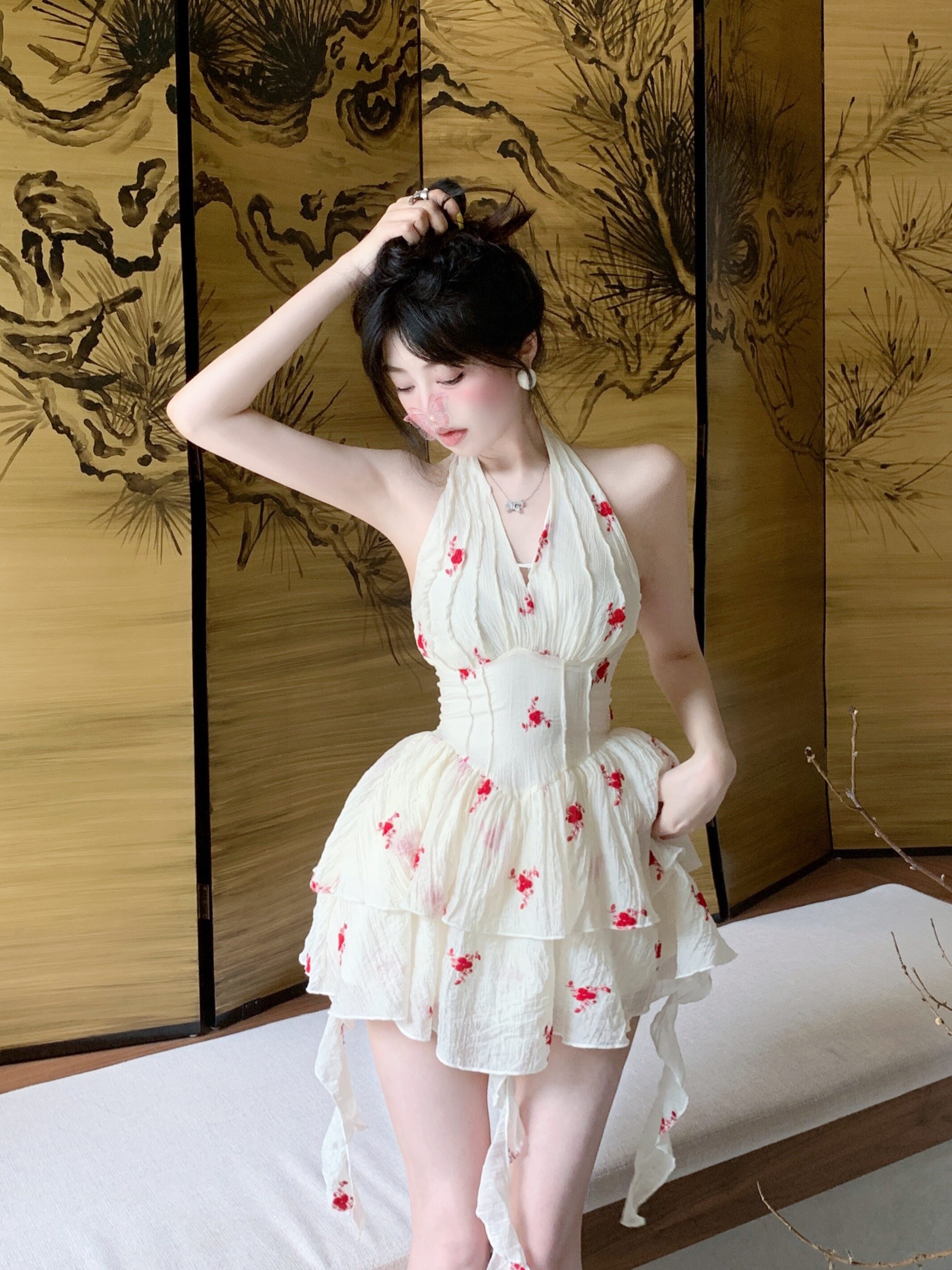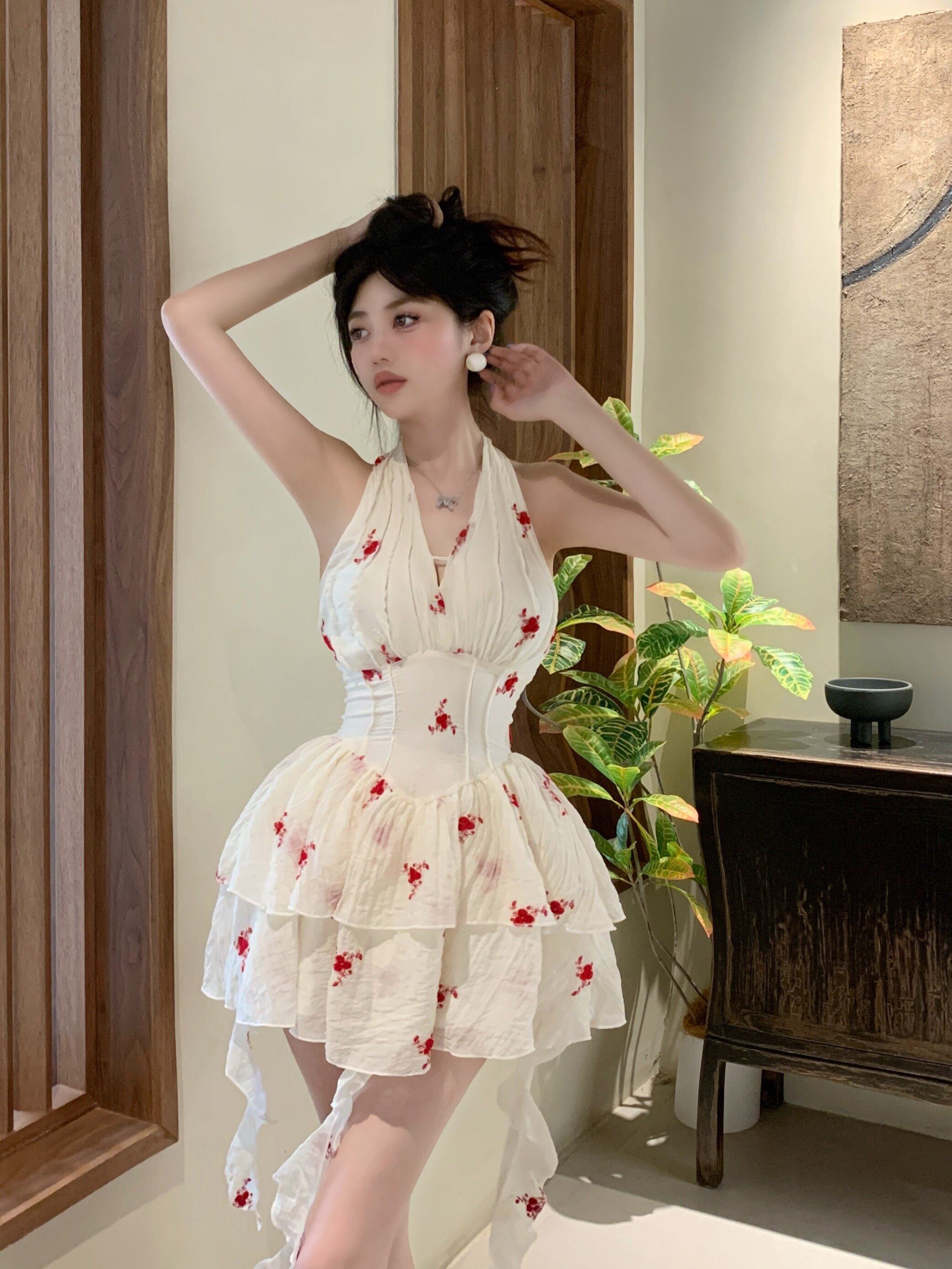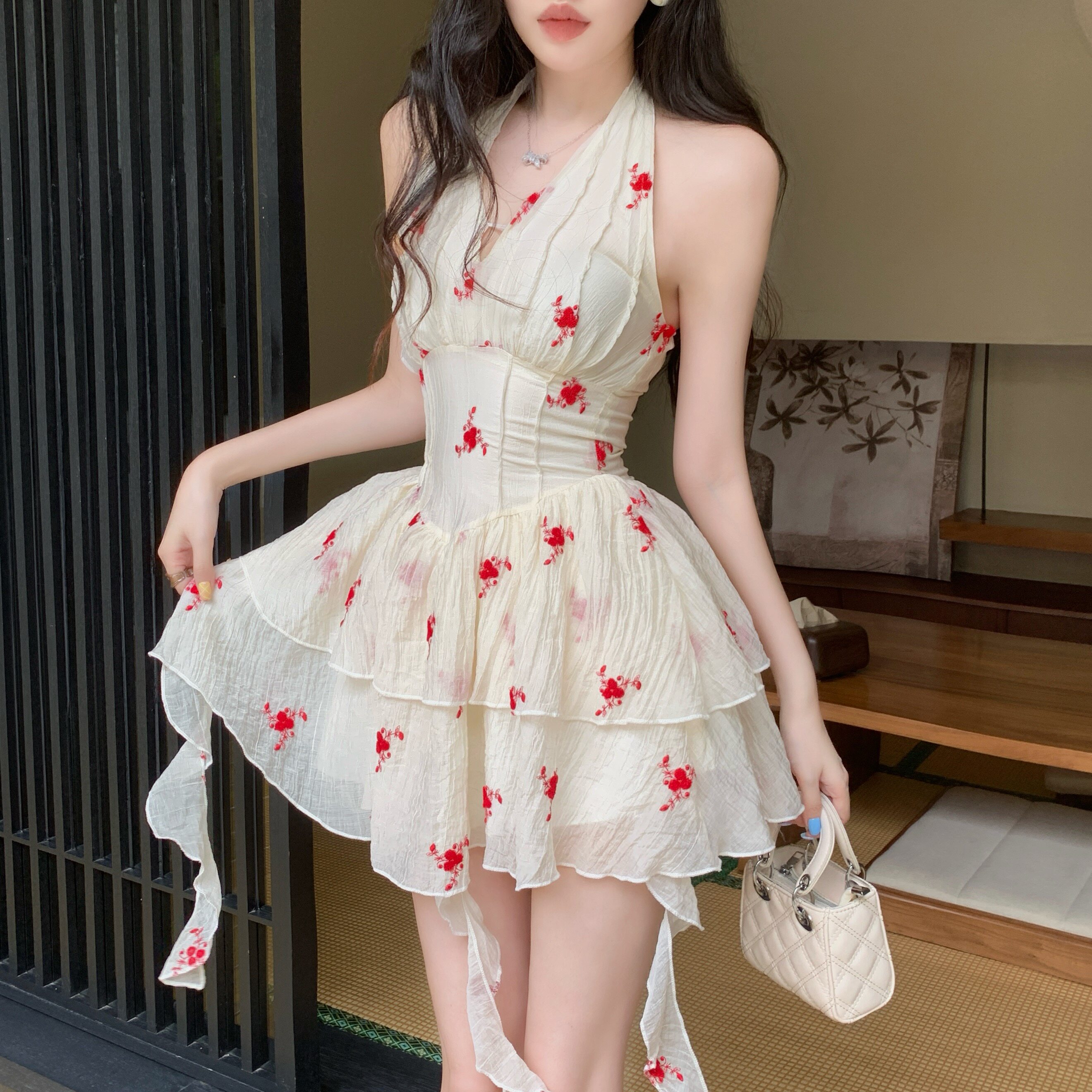 Красивое летнее французское платье с V-образным вырезом и V-образным вырезом для женщин с нежной и чистой юбкой-пачкой в западном стиле с цветочным принтом Platycodon