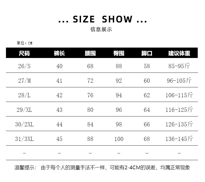 | Размер: | 26/с предложение 85-95 Catties, 27/м предложение 96-105 Catties, 28/L Рекомендуется 106-115 кот, 29/XL Предложение 116-125 Catties, 30/2xl Предложение 126-135 Catties, 31/3xl Предложение 136-145 кот |