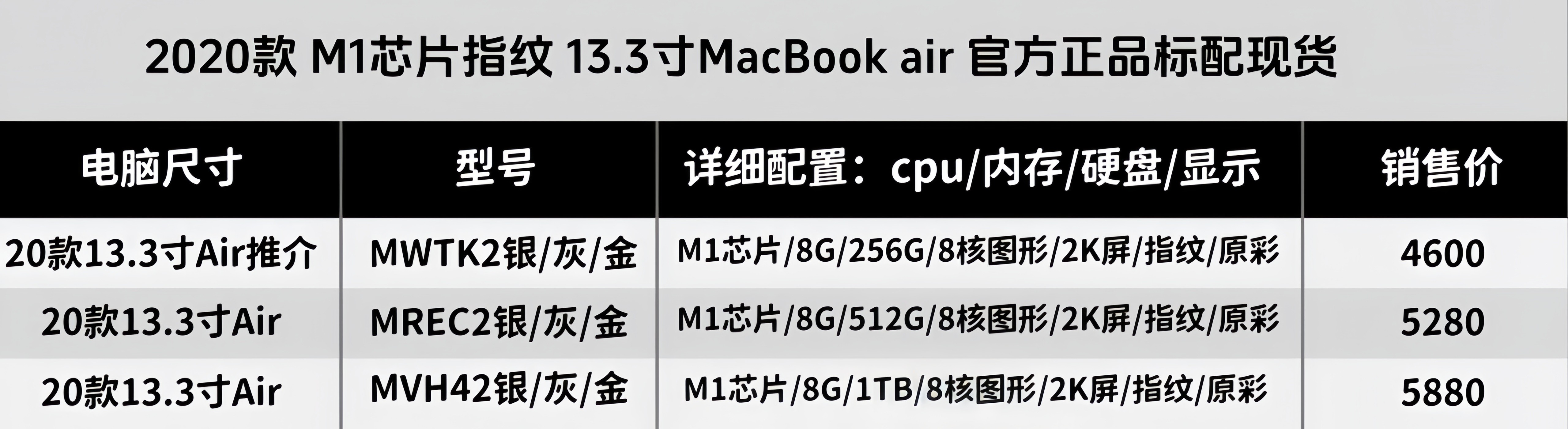 - 20 моделей с 13,3-дюймовым чипом AirM1/8 ГБ/1 ТБ/8-ядерной графикой/экраном 2K/отпечатками пальцев/оригинальным цветом