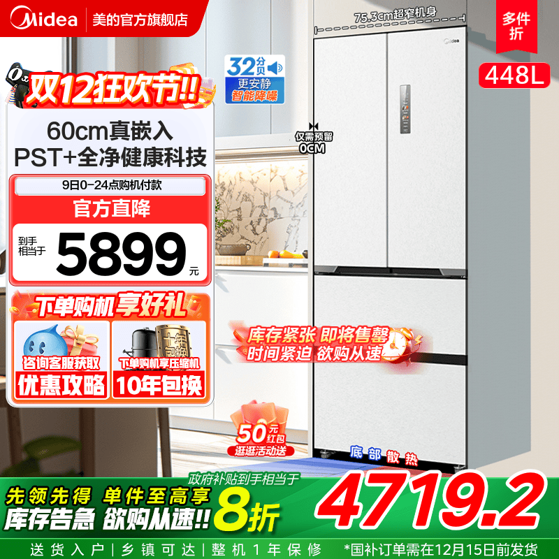 Midea M60cm Ultra -Thin 470 холодильника с нулевым французским двойным двухуровневым многоуровневым много -классом, один уровень, холодный, безморозный домашний