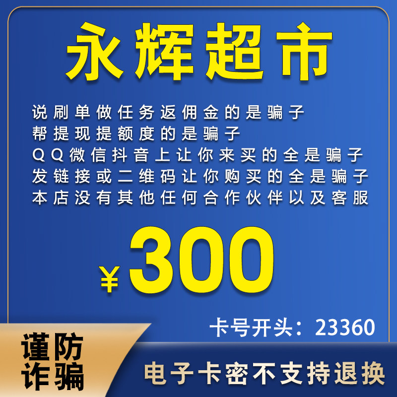Электронная карта супермаркета Yonghui на 300 юаней. Код карты. Подарочная карта для покупок, начиная с 23360. Электронная карта Yonghui на 300 юаней.