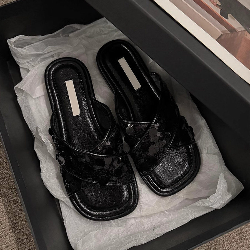 Блестки для ногтей, слайдеры, тапочки, обувь, летние черные сандалии, в корейском стиле, новая коллекция, изысканный стиль