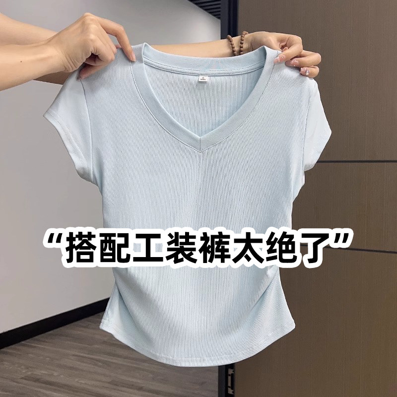 Синяя летняя футболка с коротким рукавом, короткий корсет, в обтяжку, V-образный вырез, высокая талия, в западном стиле
