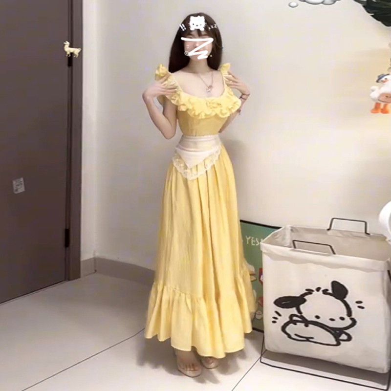 Желтое летнее платье, приталенный корсет, длинная юбка, французский стиль, 2025 года, подходит для подростков
