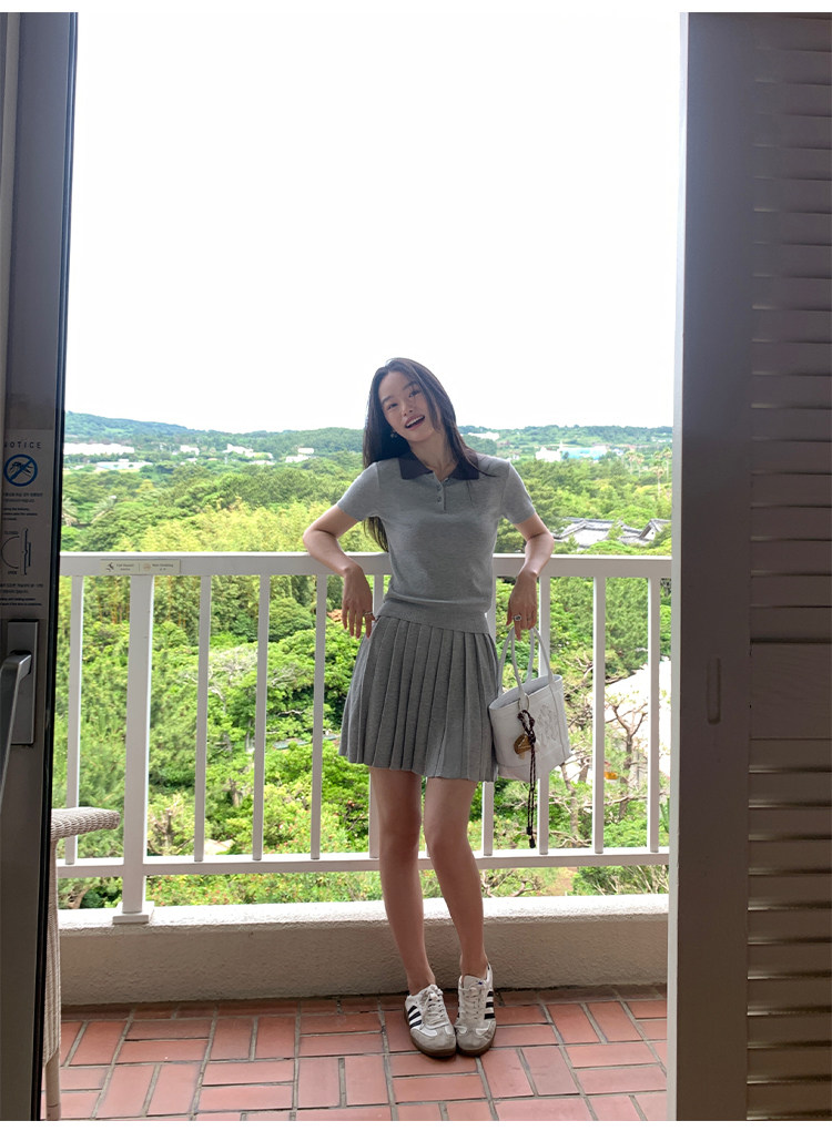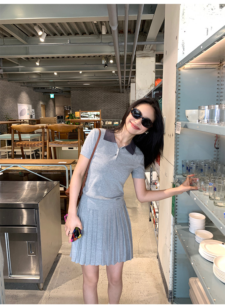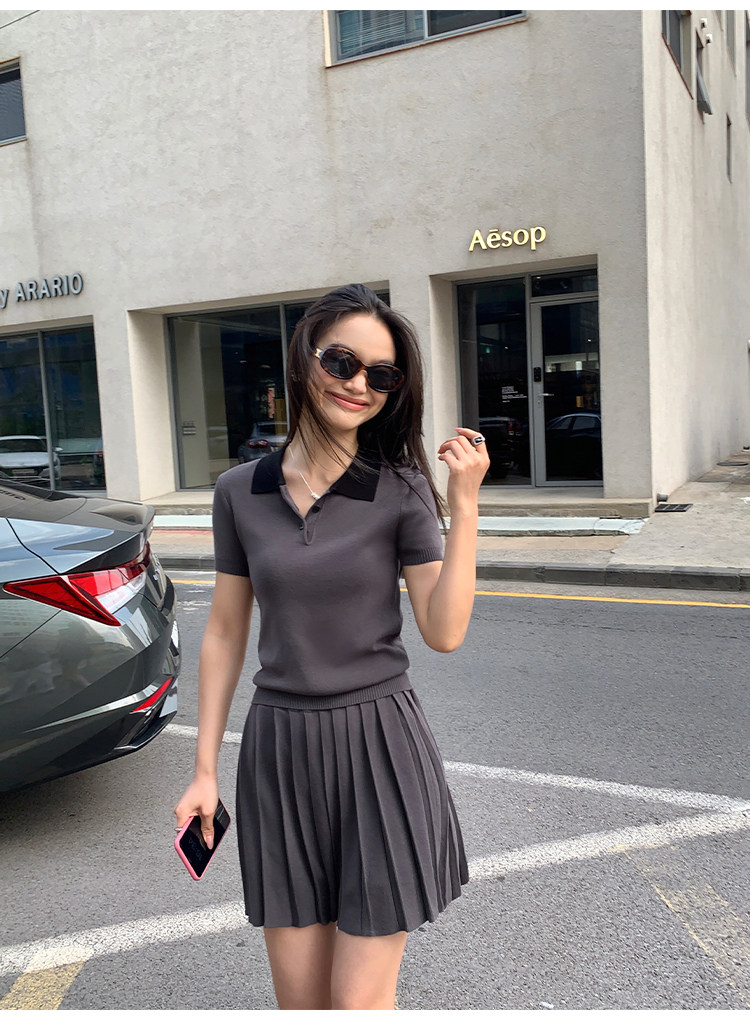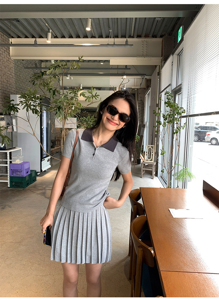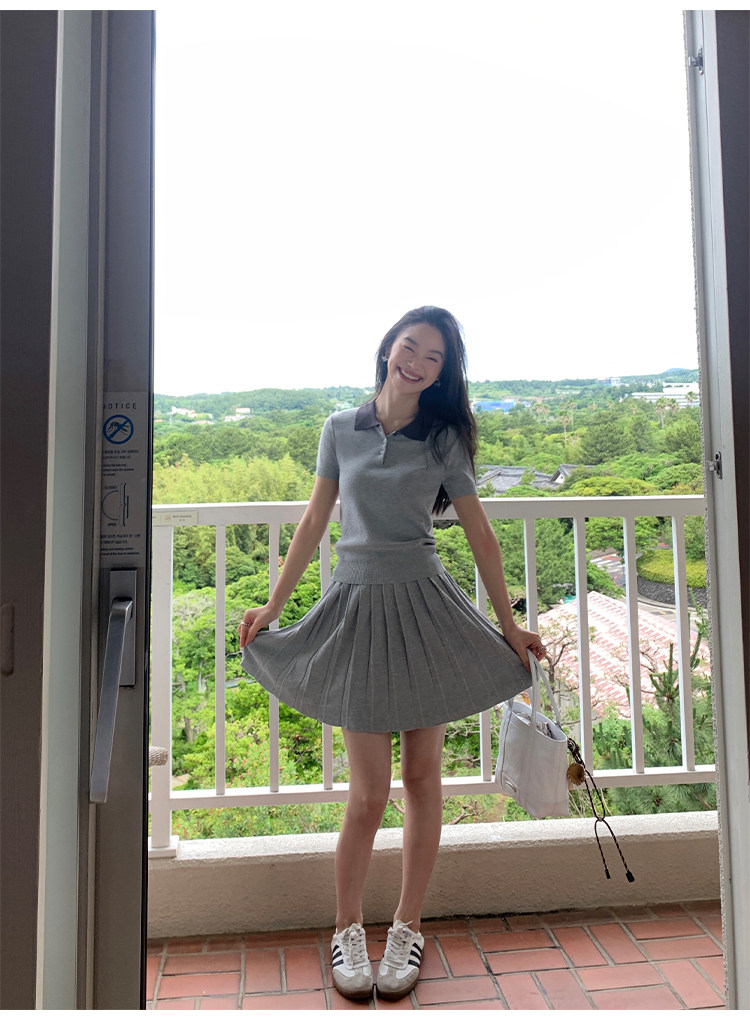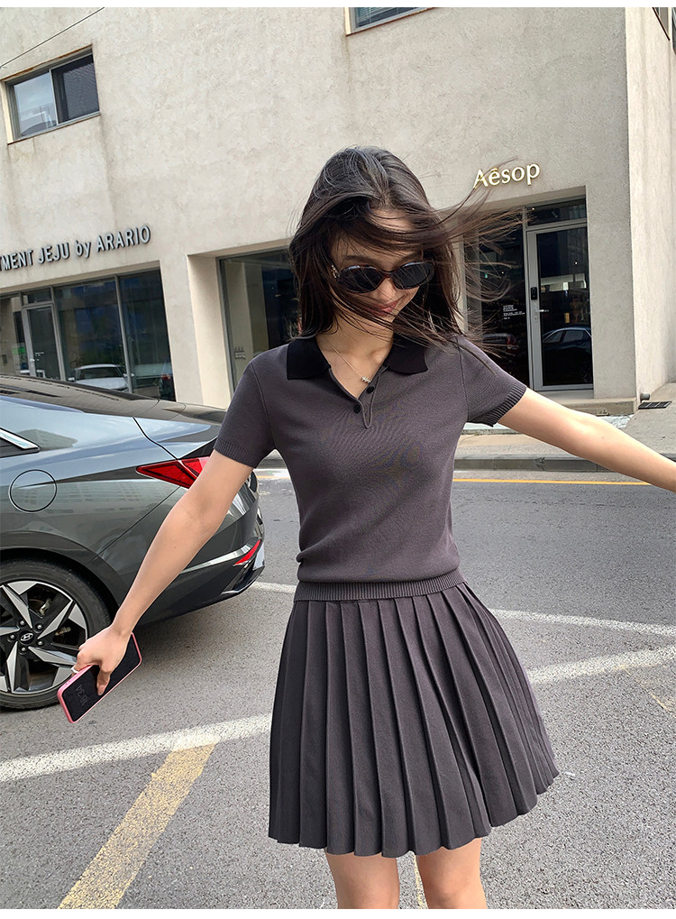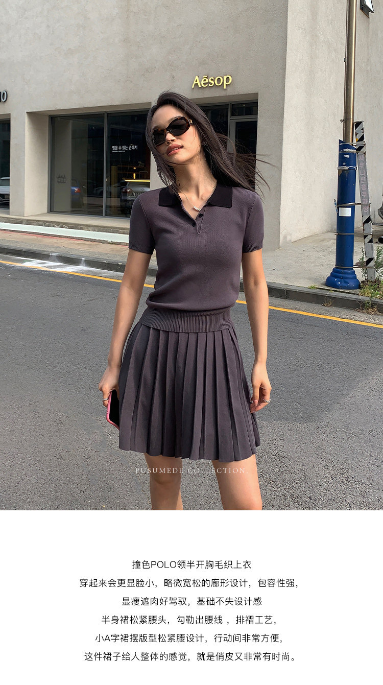 pusumede Трикотажная короткая футболка с коротким рукавом, юбка в складку, комплект, воротник поло, А-силуэт