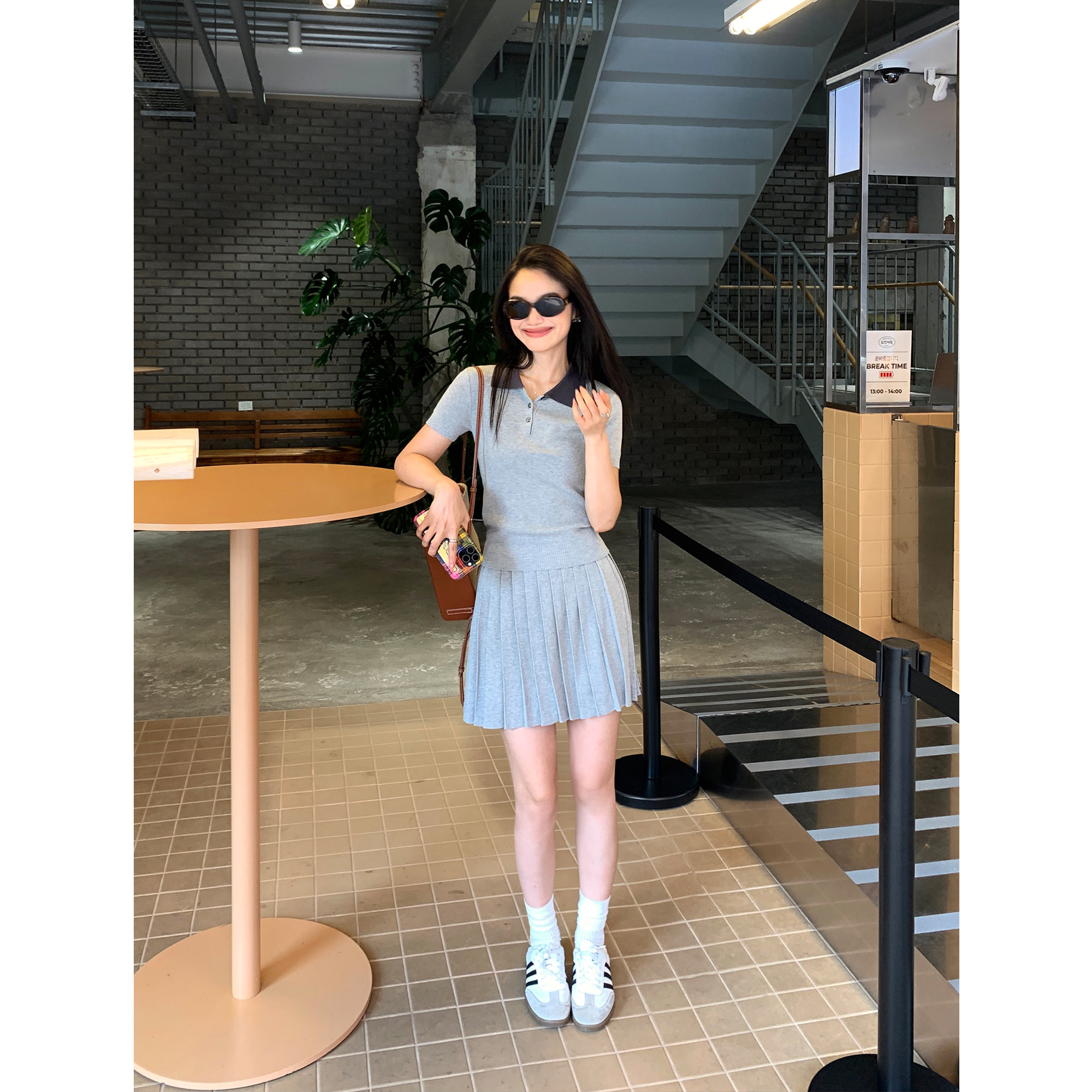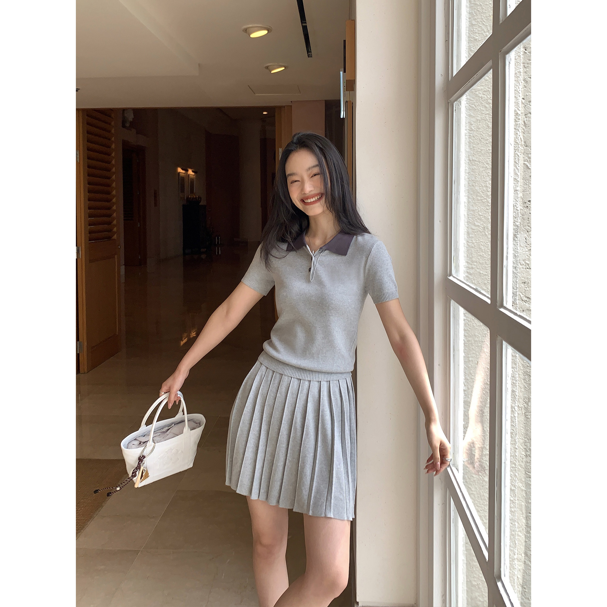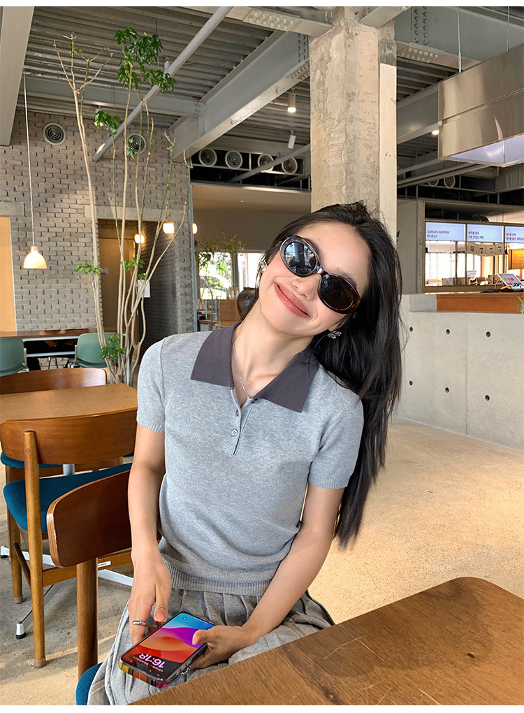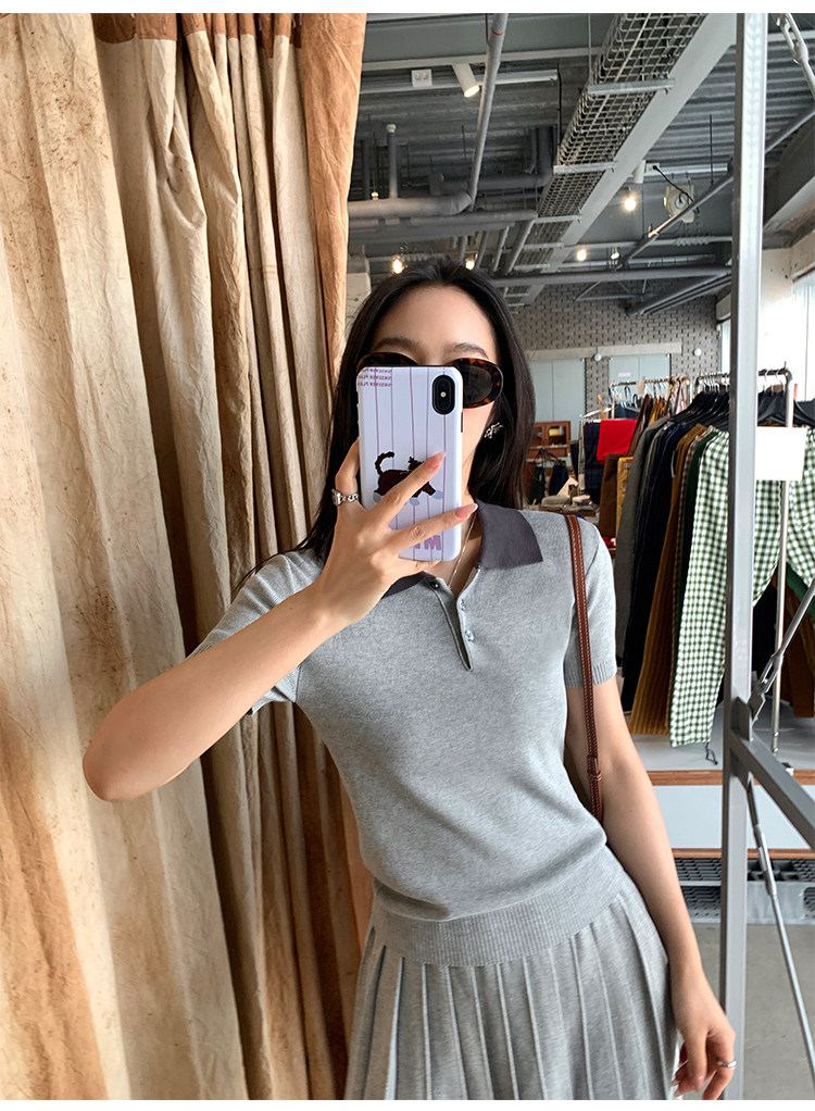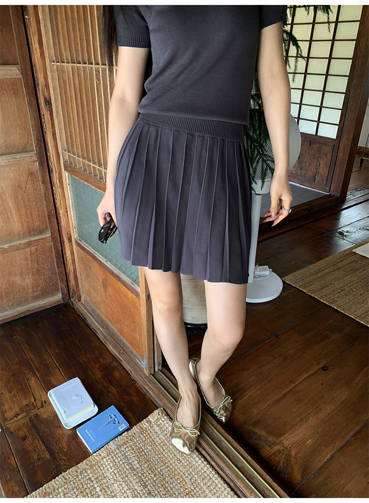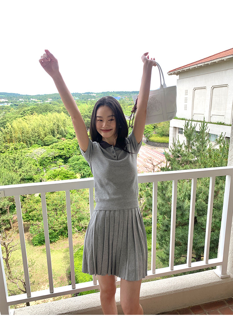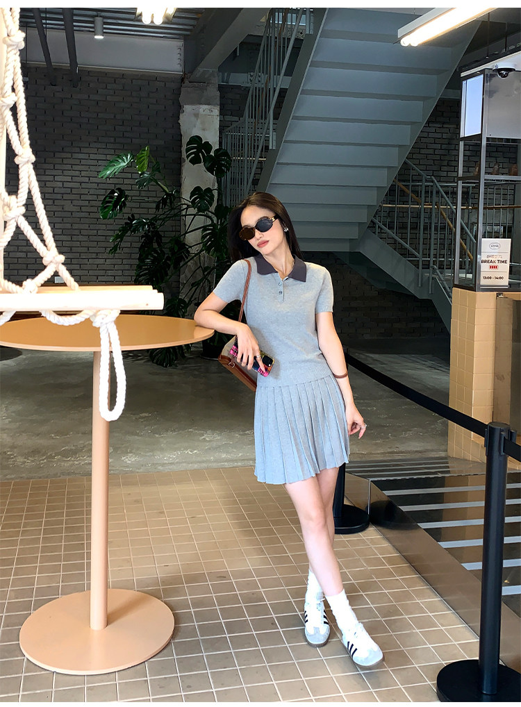 pusumede Трикотажная короткая футболка с коротким рукавом, юбка в складку, комплект, воротник поло, А-силуэт