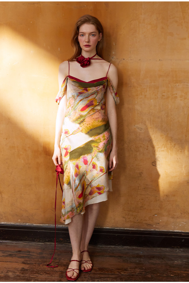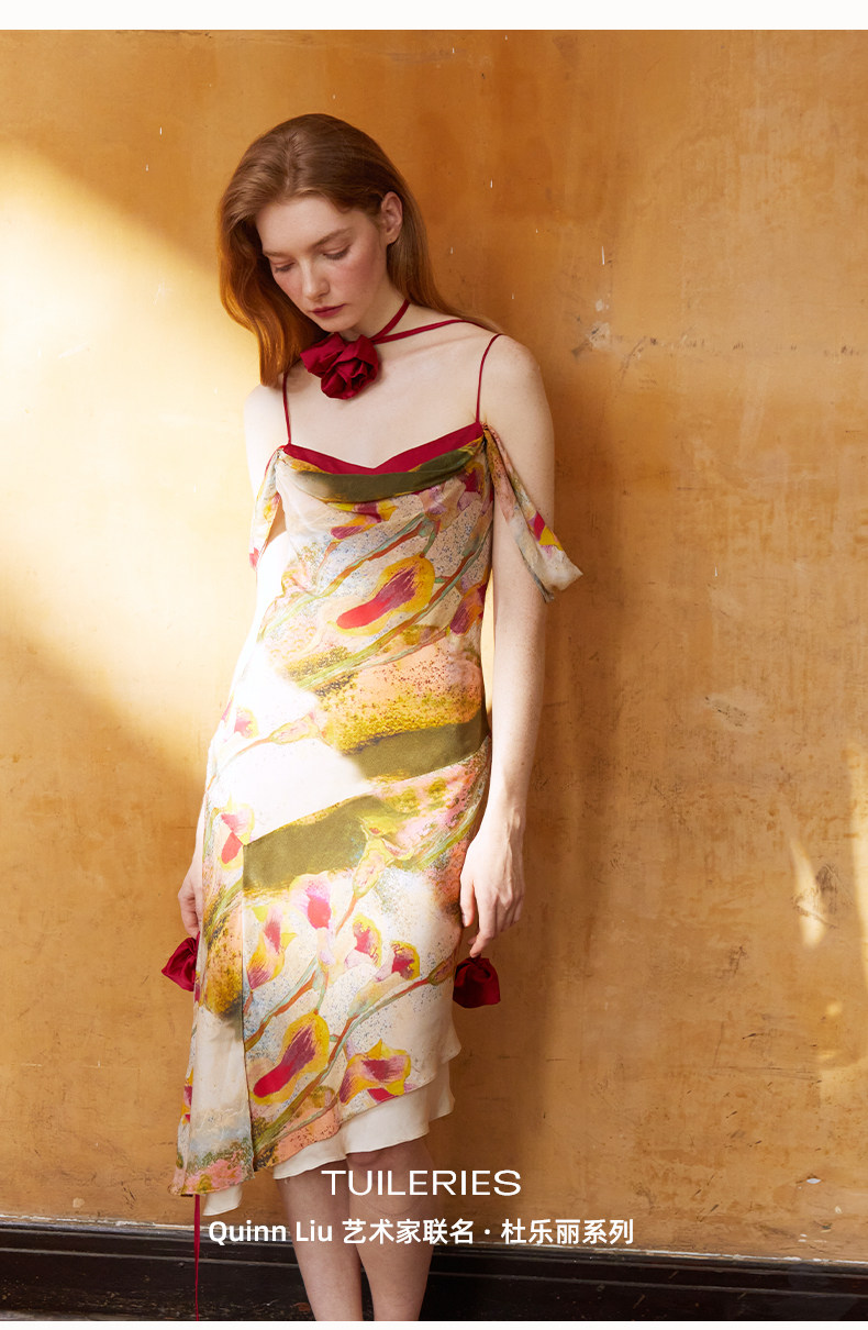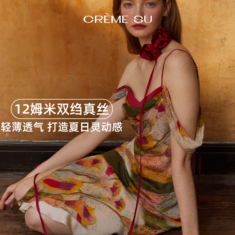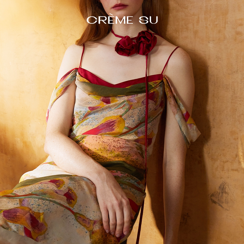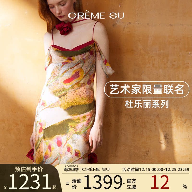 CremeSu Шелковое платье совместного бренда Art, ограниченная серия, праздничное платье серии Tuileries с ручной росписью и принтом каллы.
