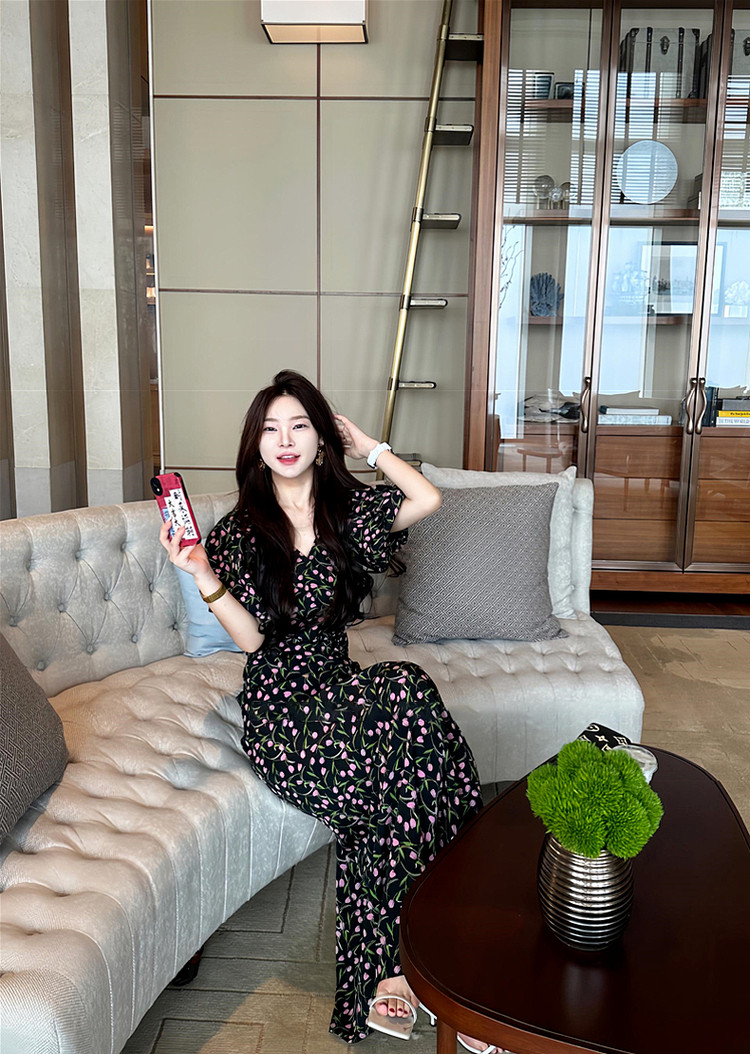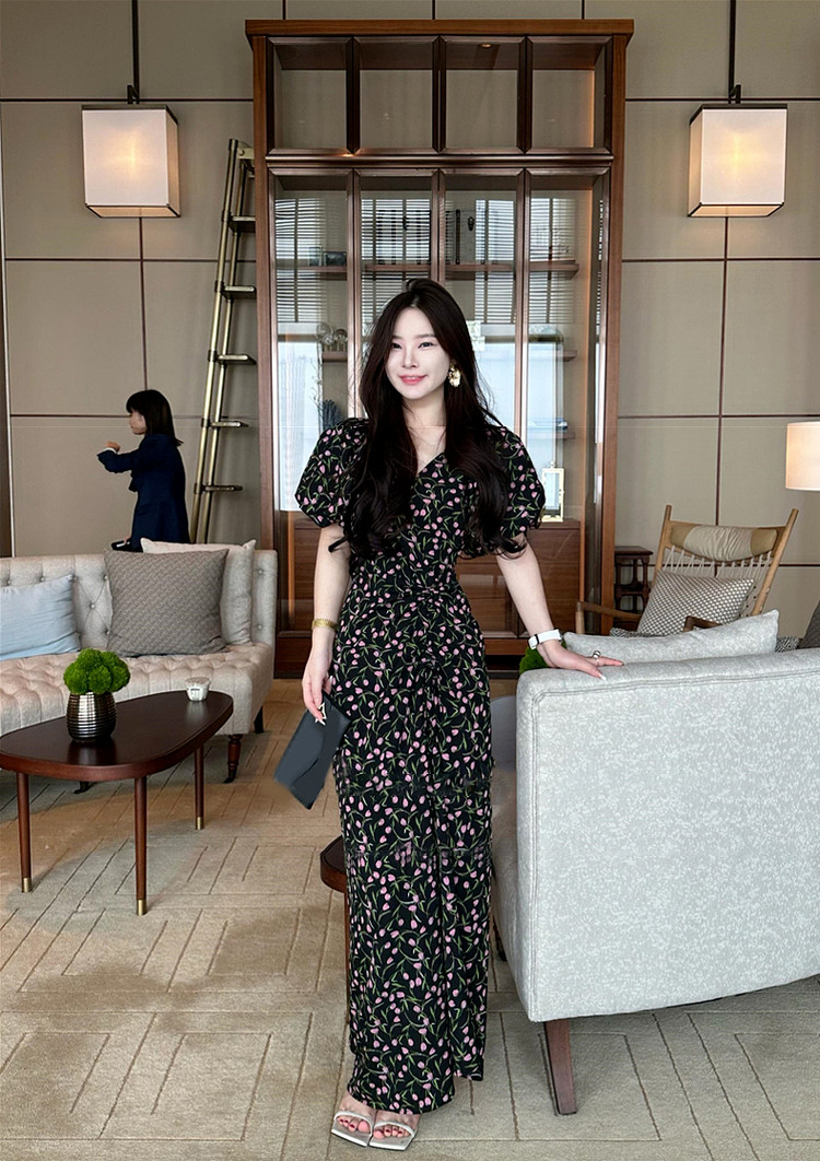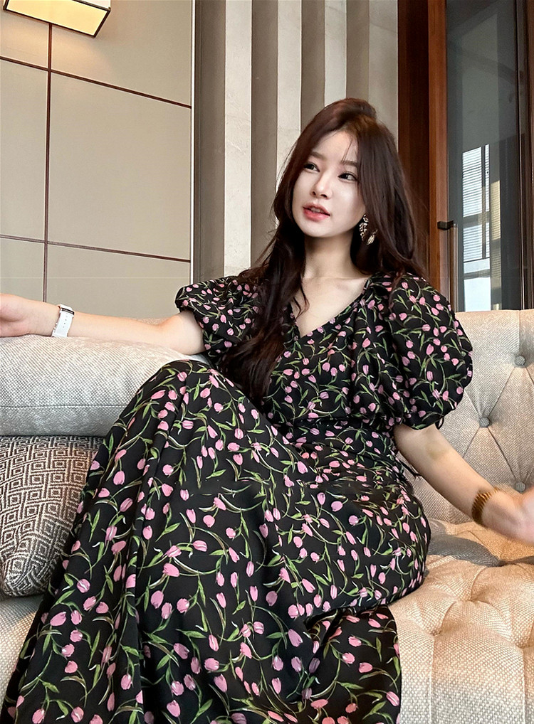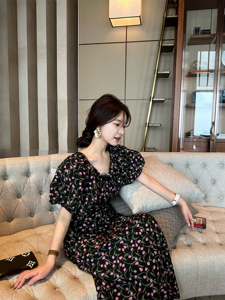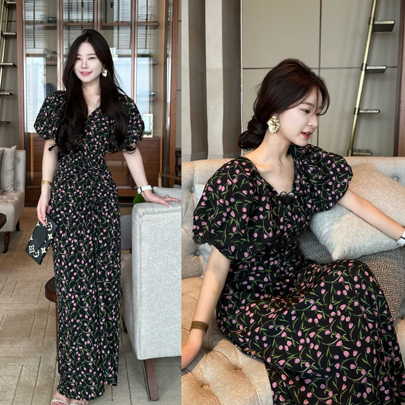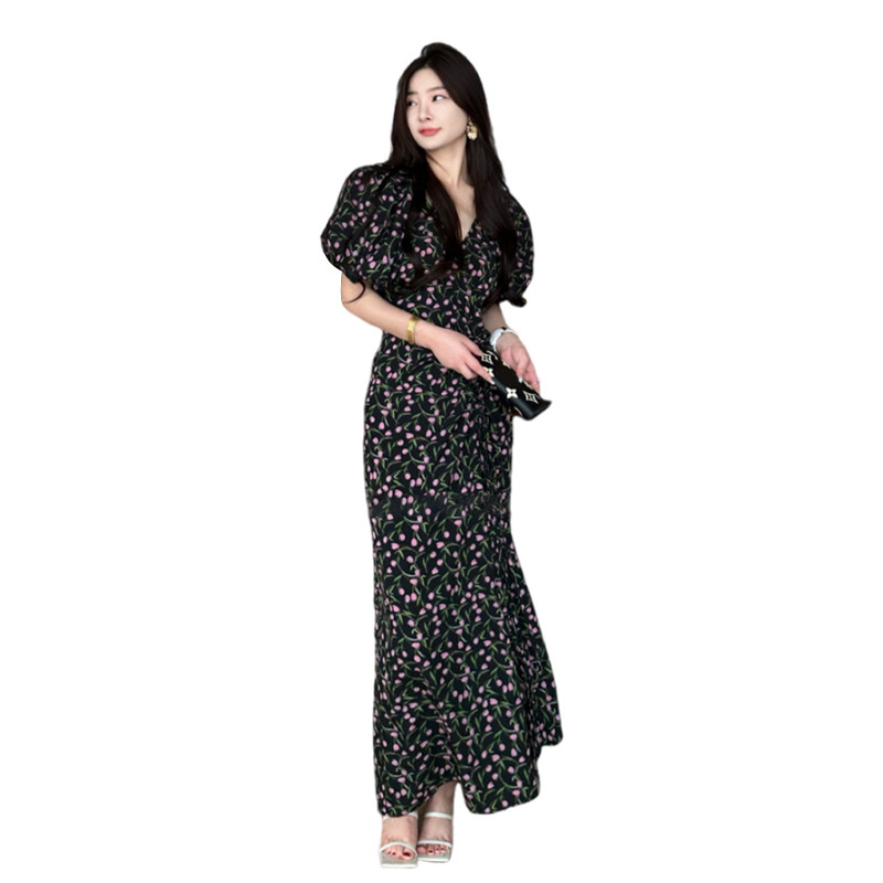 Черный летний приталенный корсет, длинная юбка, французский стиль, цветочный принт, подходит для подростков