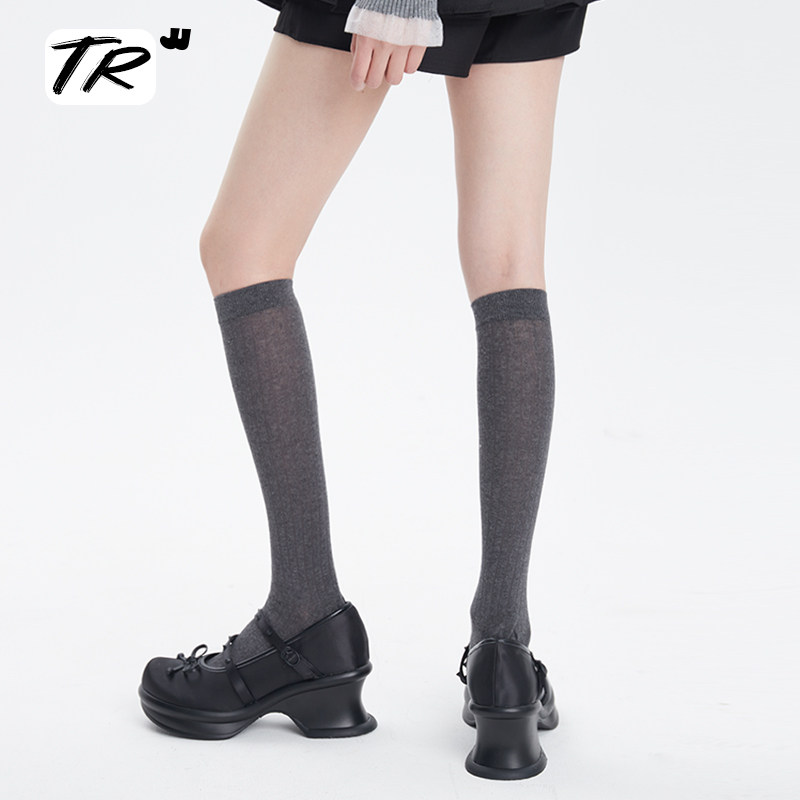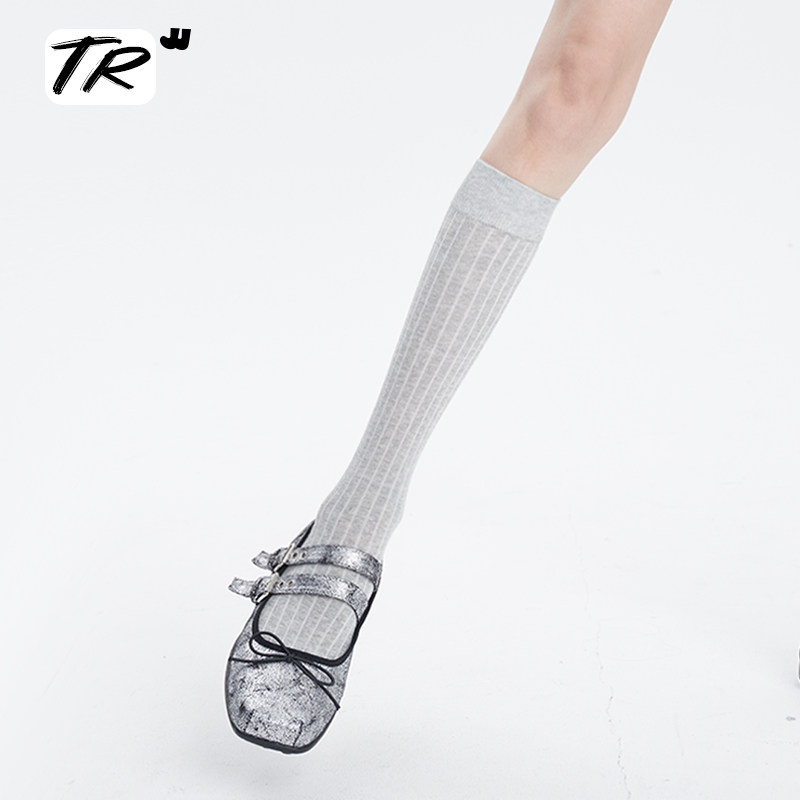 Весна и лето тонкие хлопковые сплошные цвета вертикальные полосы Miu - серые носки теленка женские весенние и осенние модели тонкие носки ног