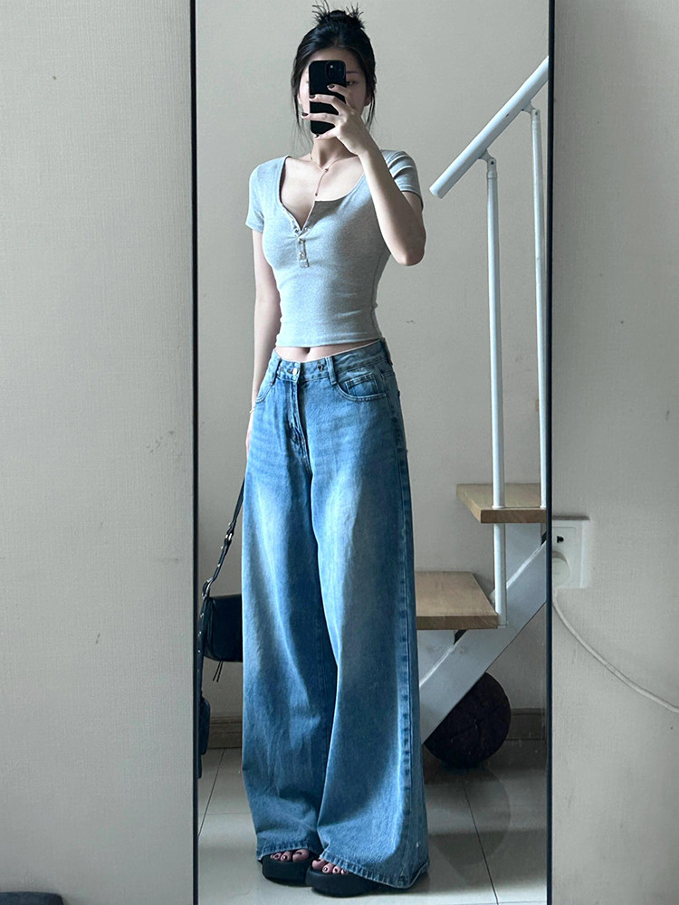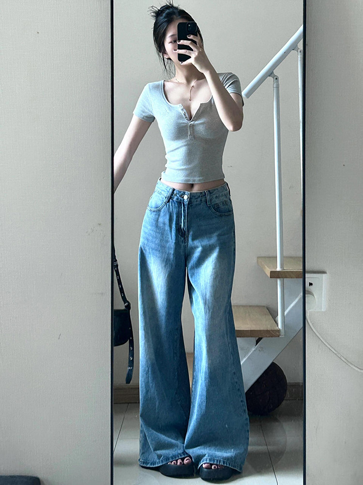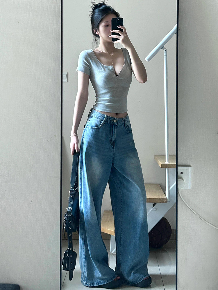 Ретро летняя короткая футболка с коротким рукавом, в американском стиле, V-образный вырез, в обтяжку, облегающий крой