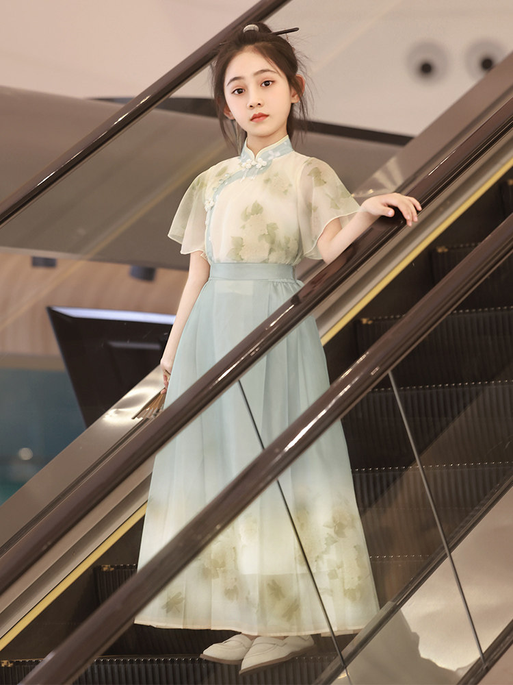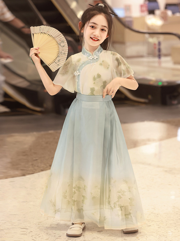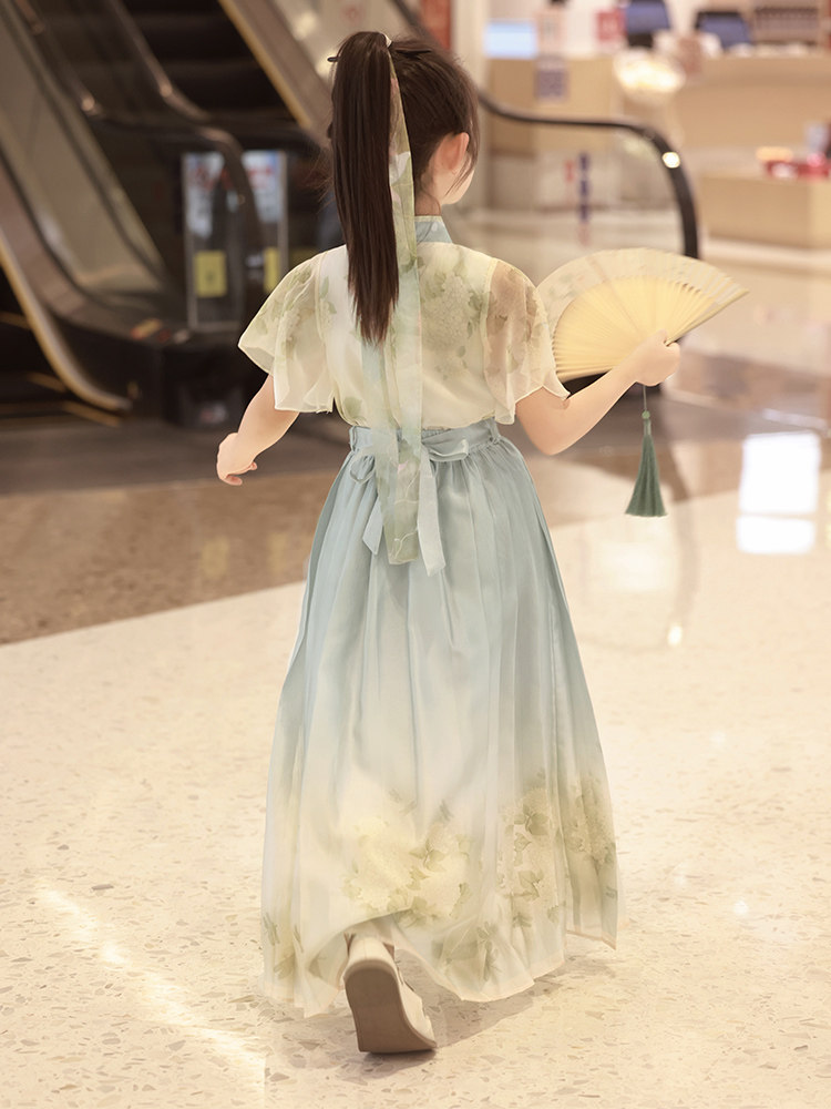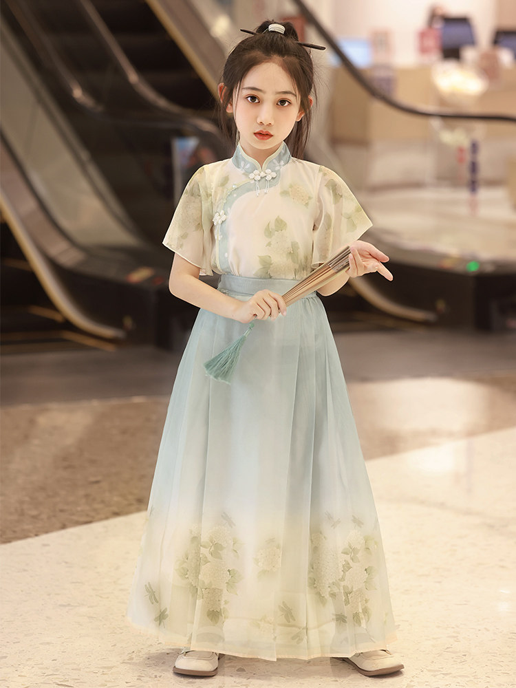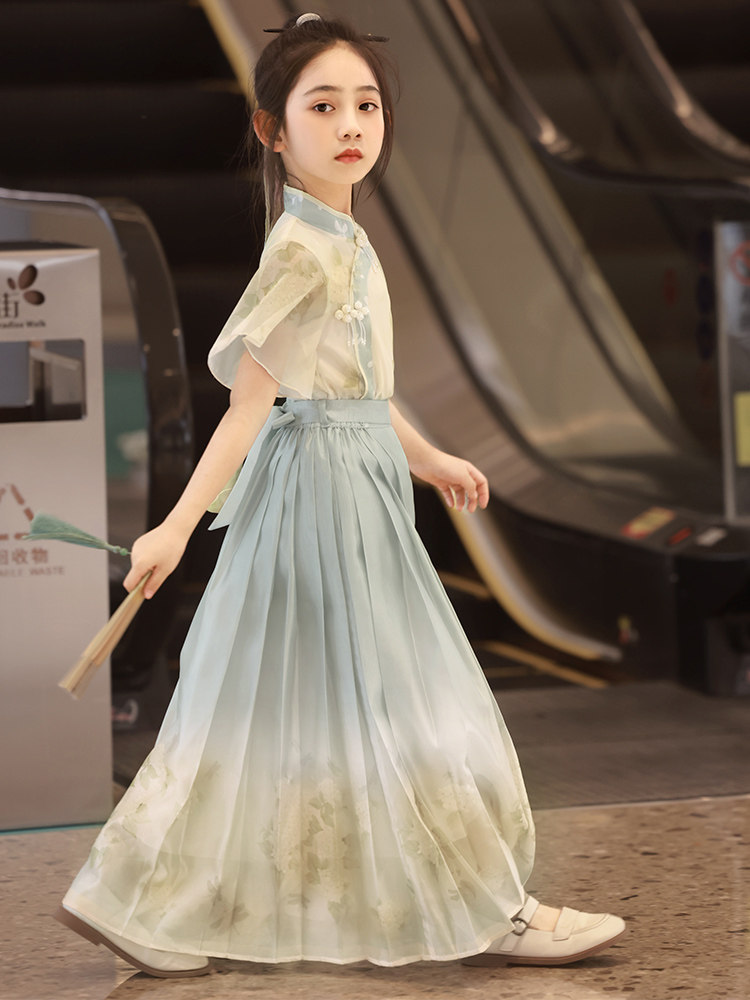 British Next Kids Mint Green Новые китайские девушки Hanfu Лето лето 2024 г. Новая лошадь юбка для лапши Национальный ветер