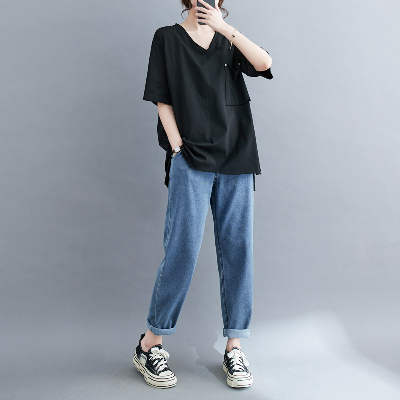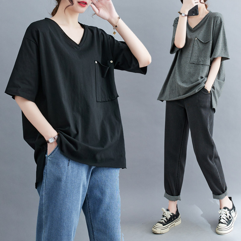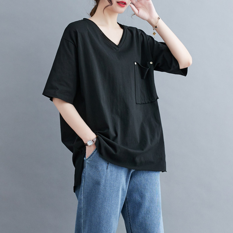 Однотонная летняя футболка для отдыха, V-образный вырез, по фигуре, большой размер