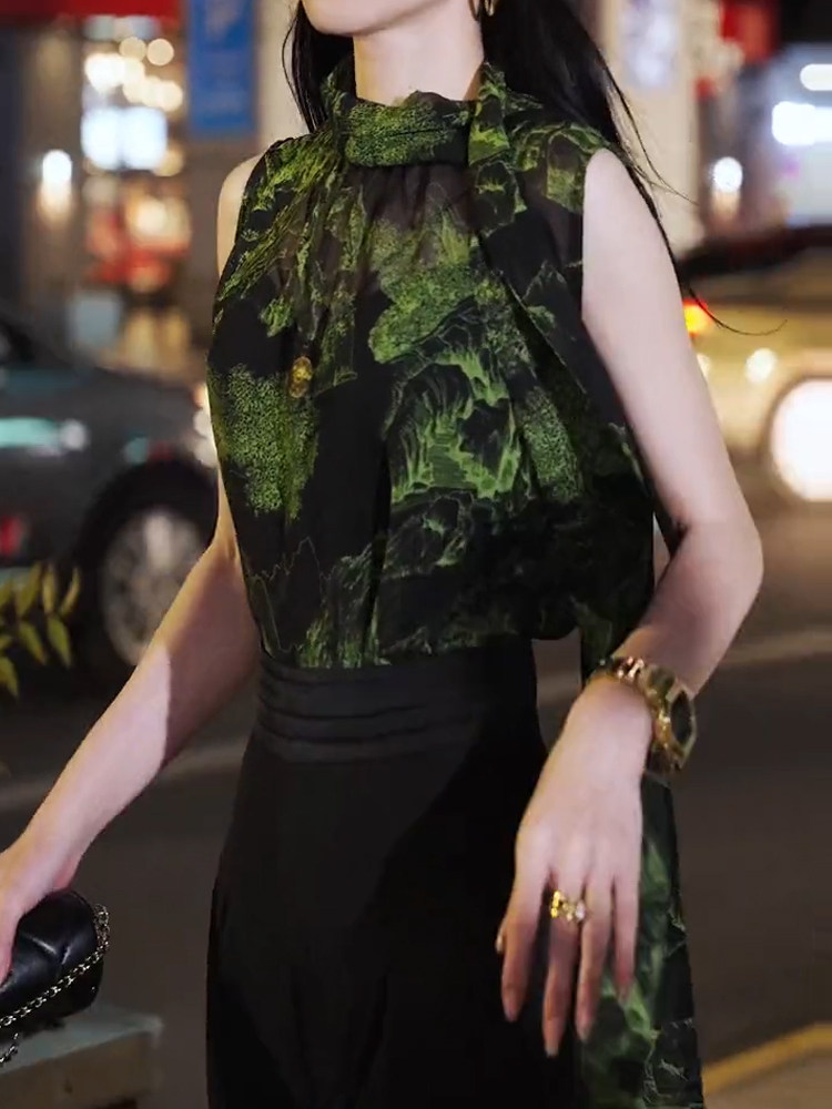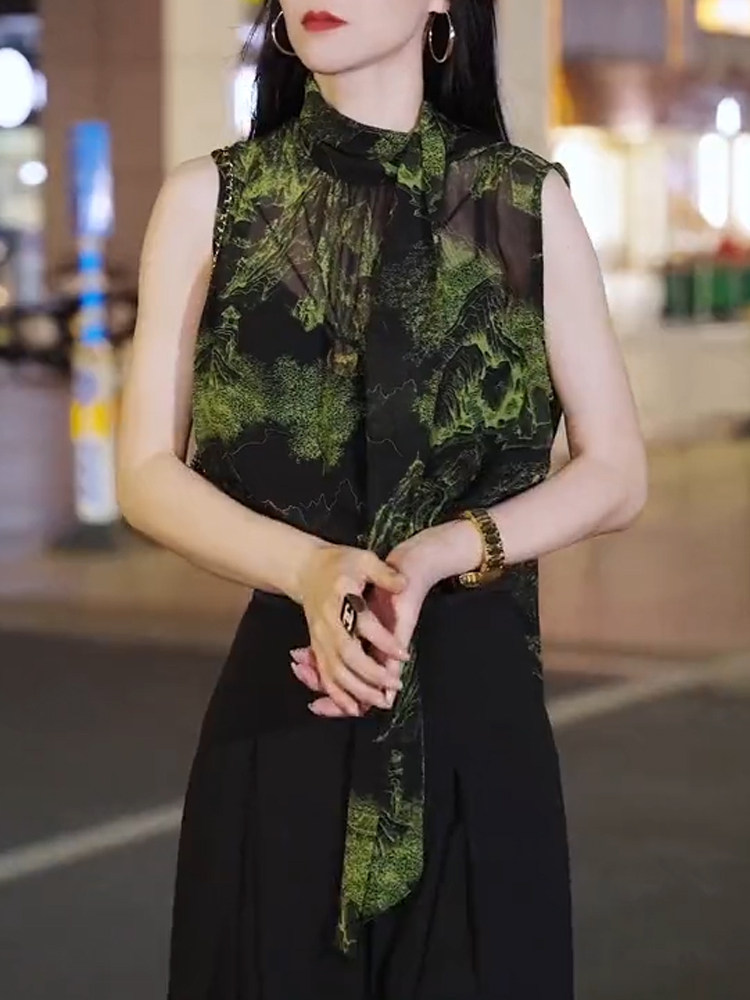 Элегантная зеленая шифоновая летняя рубашка без рукавов, изысканный стиль, яркий броский стиль, оверсайз