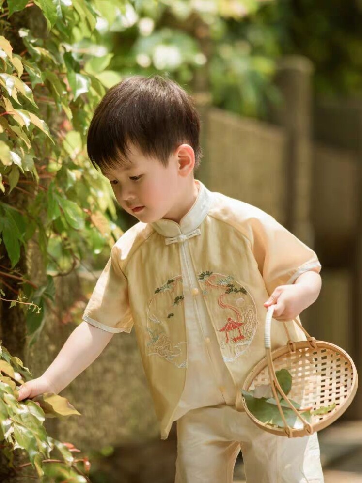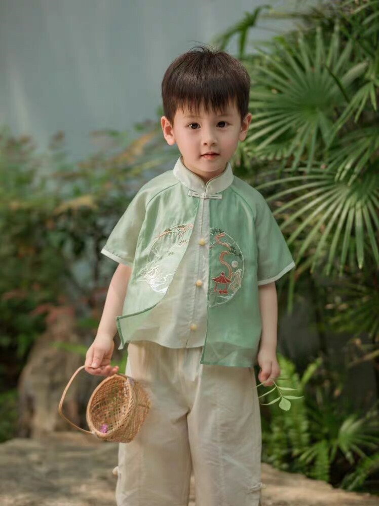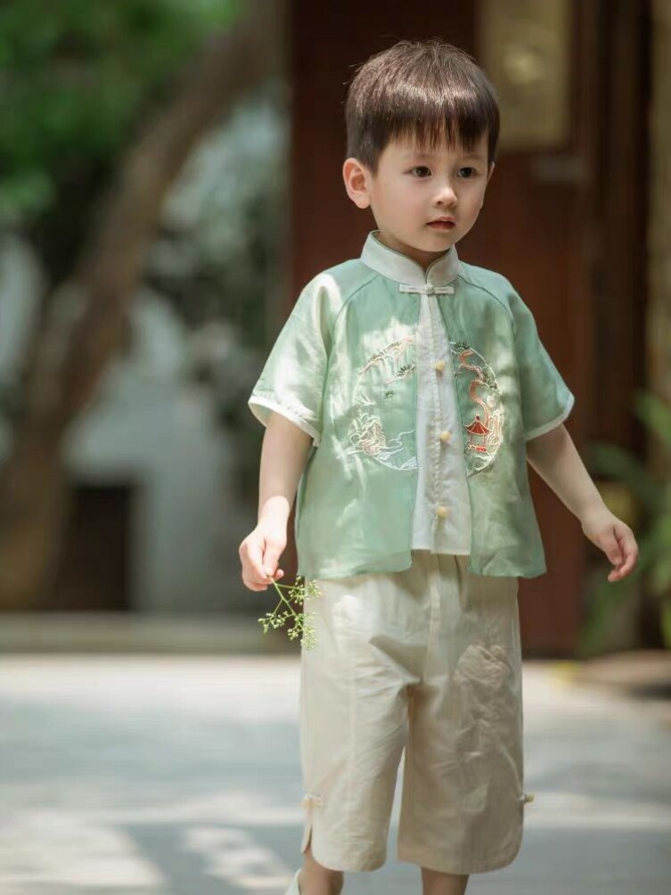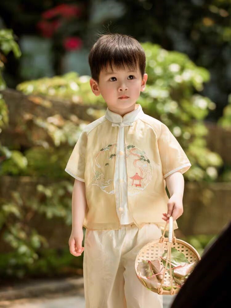Летнее ханьфу для мальчиков, комплект, короткий рукав, китайский стиль, с вышивкой