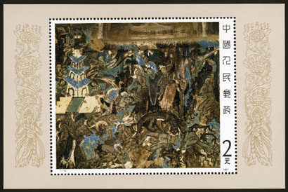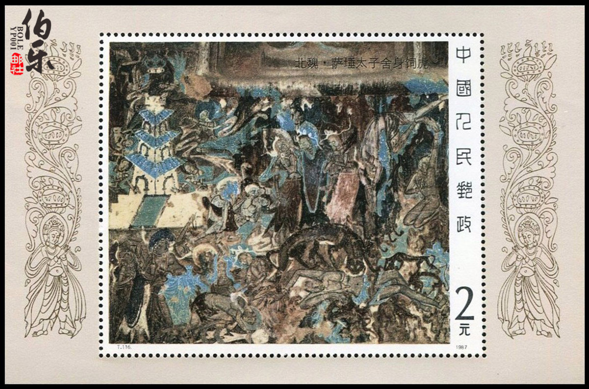 Фотокопия, количество зубцов: 11*11,5, размер листа: 130*93 мм, размер марки: 93*78, номинал: 2 юаня, династия Северная Вэй.&миддот;Принц Сатао пожертвовал своей жизнью, чтобы накормить тигров Объем тиража: 3,2939 млн штук