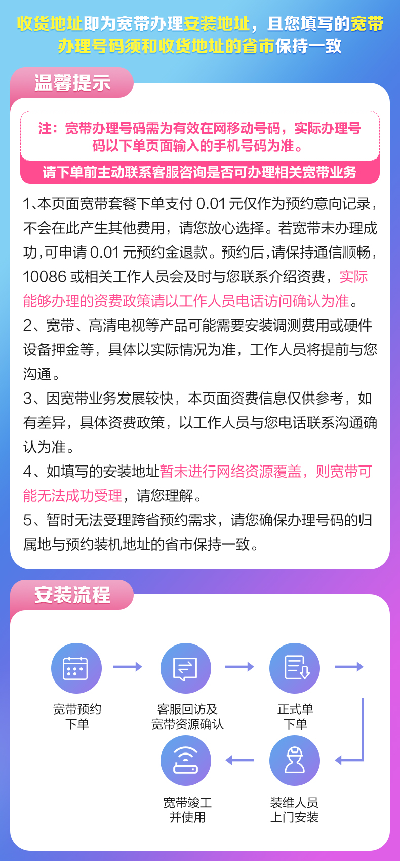 | Установка широкополосной связи и аренда: | Установка национального официального назначения широкополосной зоны, Примечание. Адрес доставки - это адрес обработки и установки широкополосного доступа, а номер обработки широкополосной связи, который вы заполняете, должен соответствовать провинции и городу, где адрес доставки, Номер обработки широкополосной связи должен быть действительным номером мобильного устройства в Интернете. |
