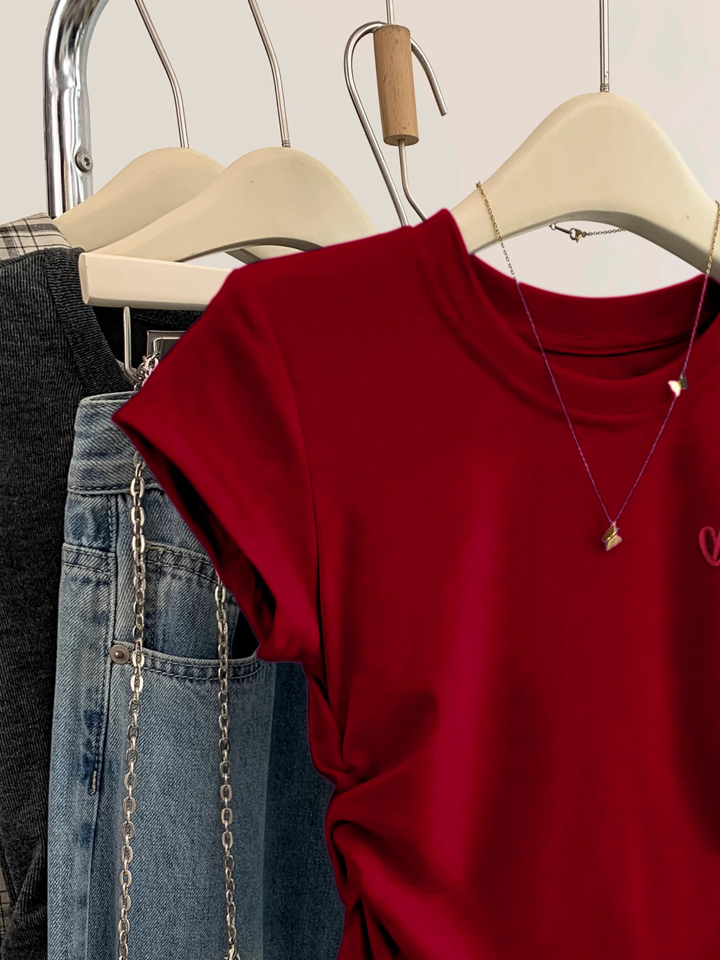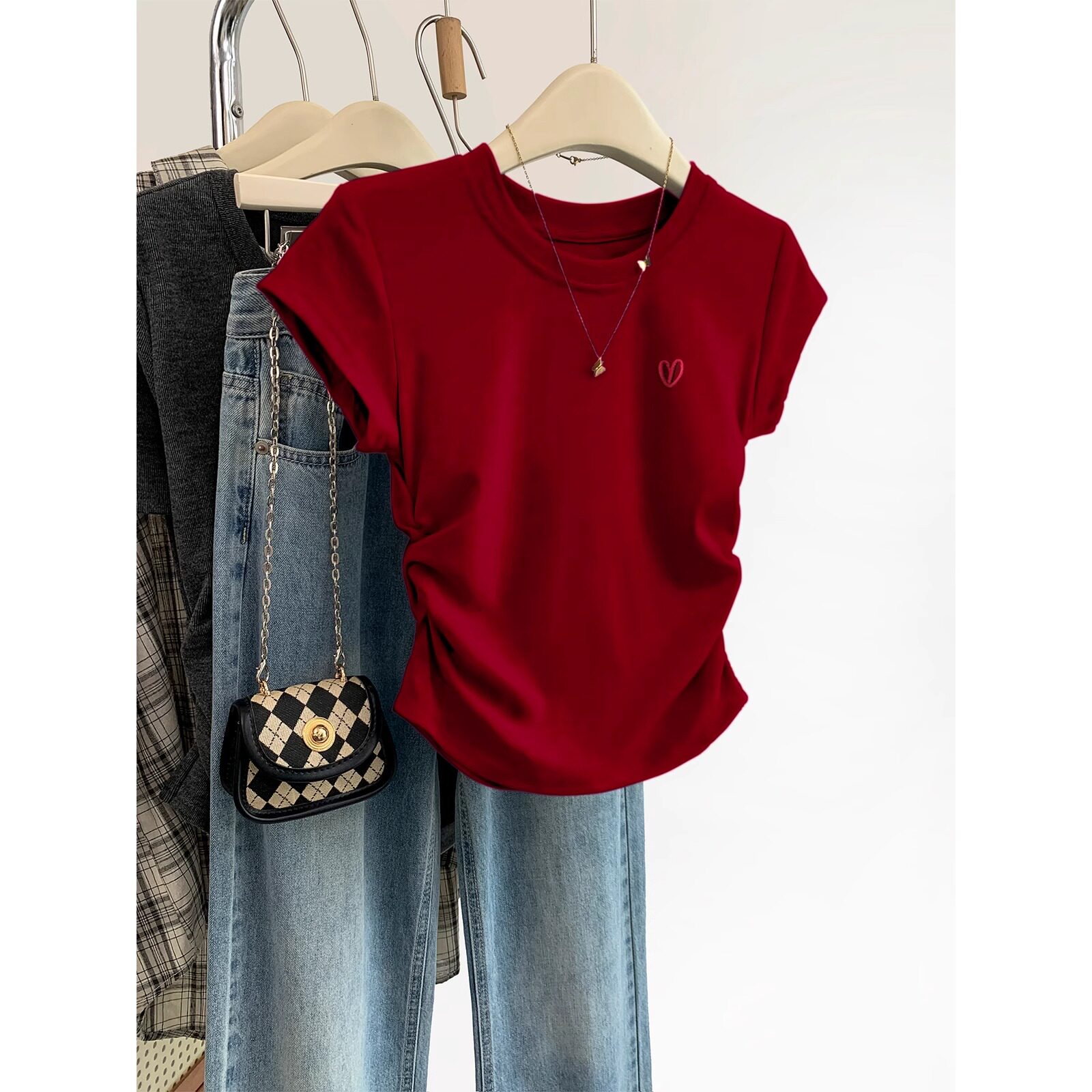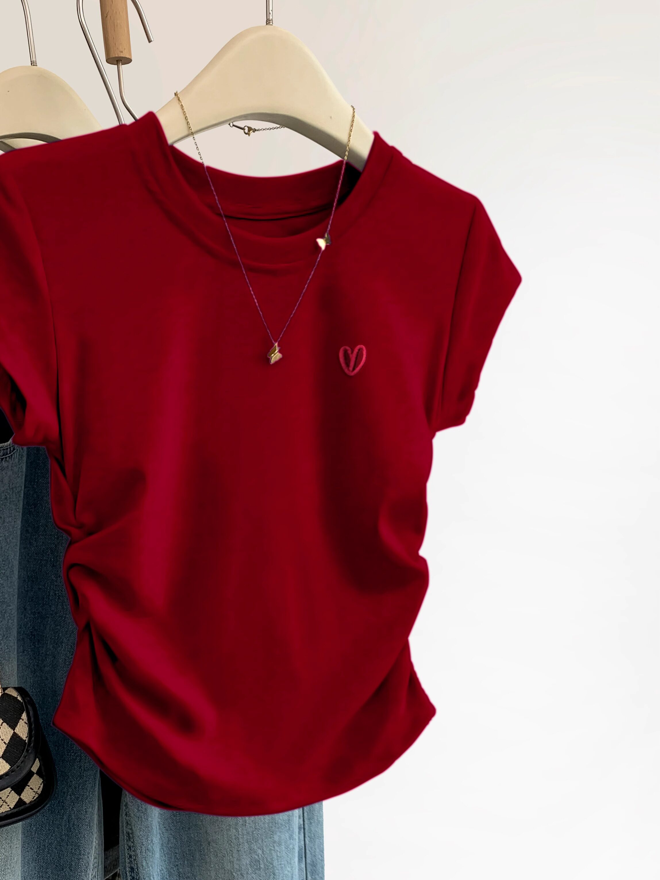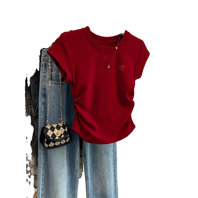 Красная летняя футболка с коротким рукавом, дизайнерский корсет с круглым воротником, с вышивкой, французский стиль