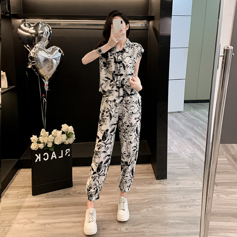 Форма для отдыха, тонкий модный спортивный костюм, шифоновые штаны, в стиле Шанель, короткий рукав, облегающий крой