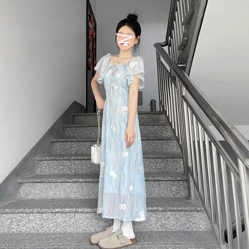 Синее летнее платье, приталенный корсет, длинная юбка, французский стиль, в цветочек, подходит для подростков