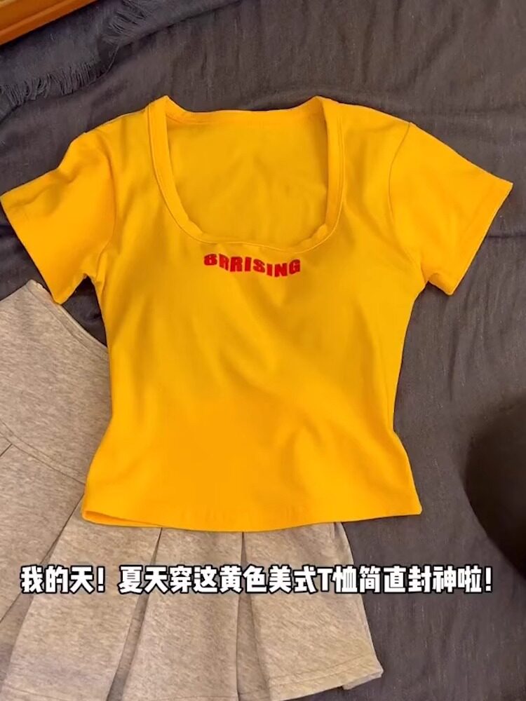 Желтая приталенная летняя модная комфортная футболка с коротким рукавом, квадратный вырез, в корейском стиле, в западном стиле