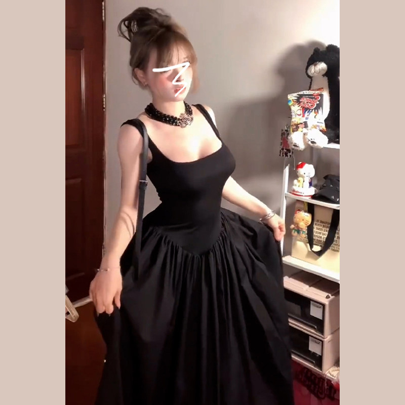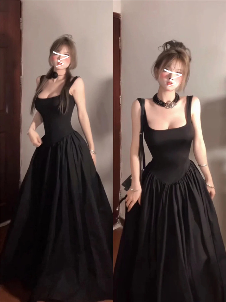 Черное летнее платье, приталенный корсет, длинная юбка, французский стиль, 2025 года, премиум класс