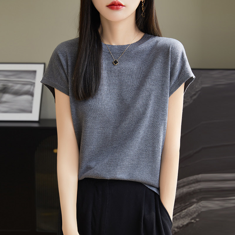 Тонкий трикотажный свитер, летняя футболка с коротким рукавом с круглым воротником, французский стиль