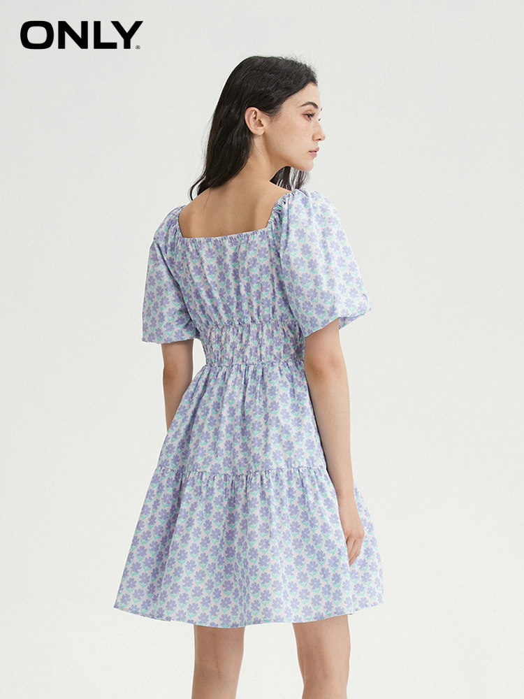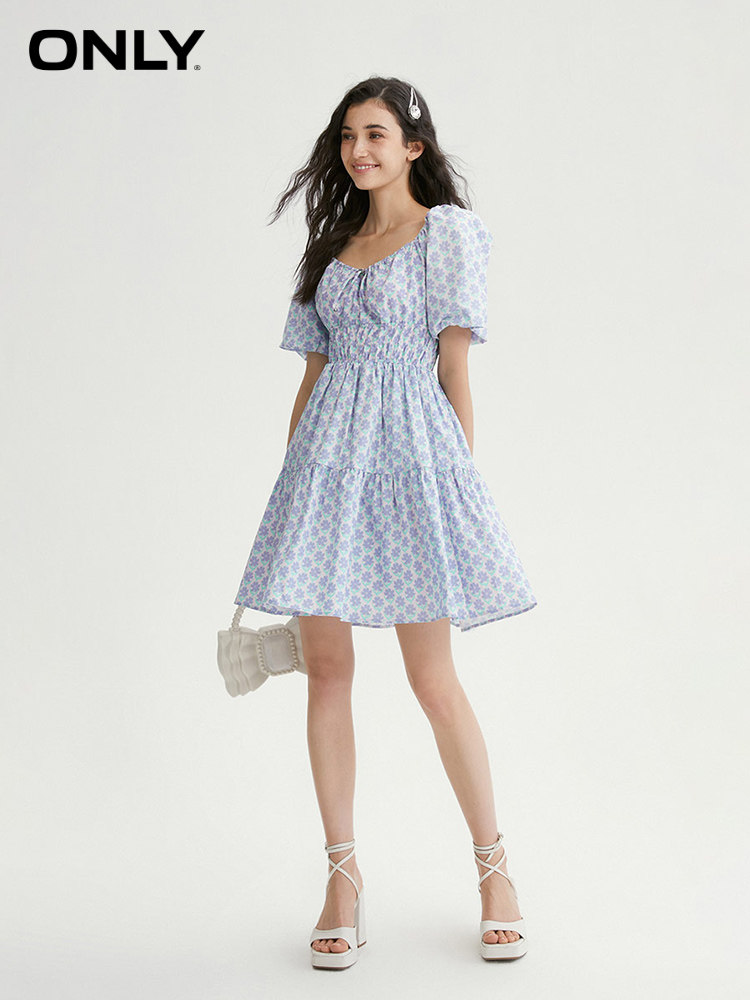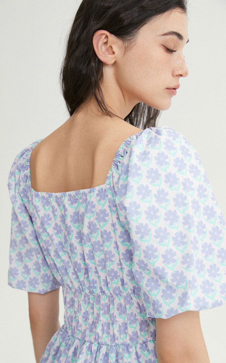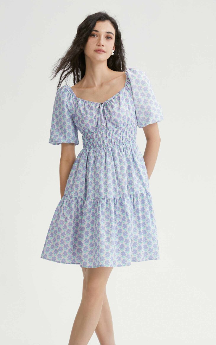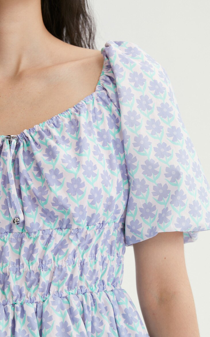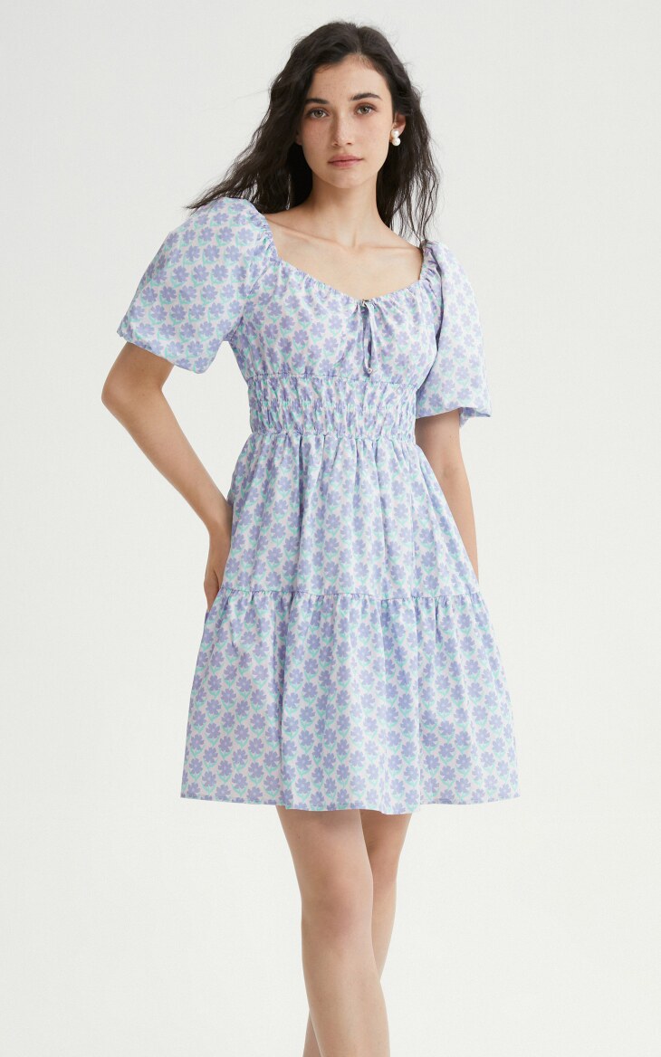 Летнее милое короткое платье, рукава фонарики, V-образный вырез, А-силуэт, цветочный принт