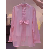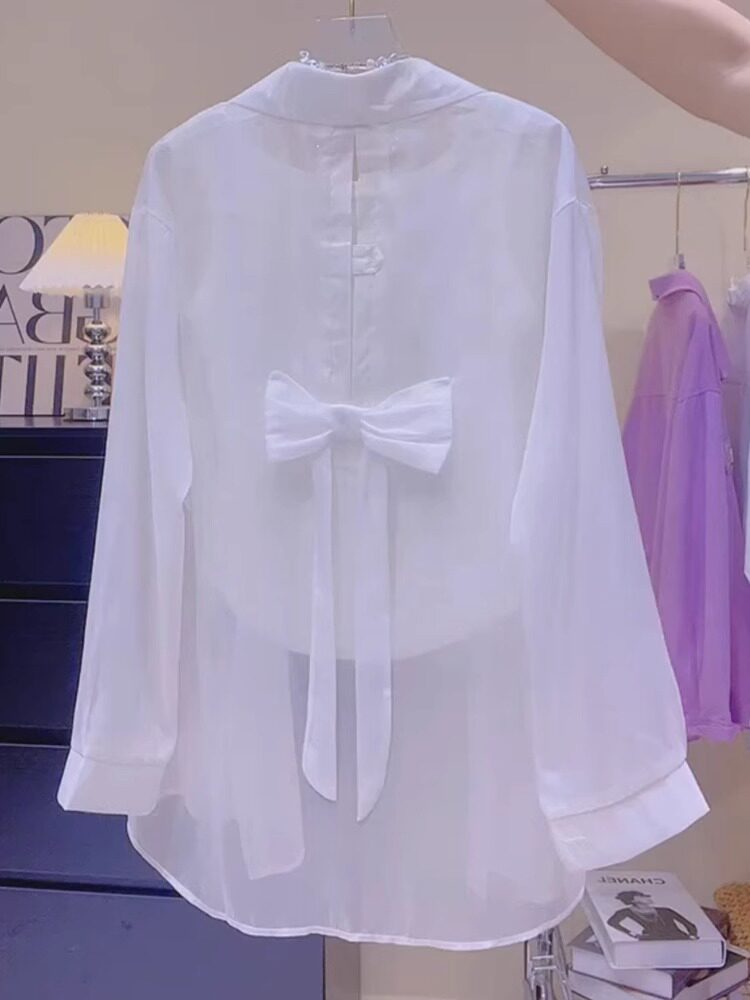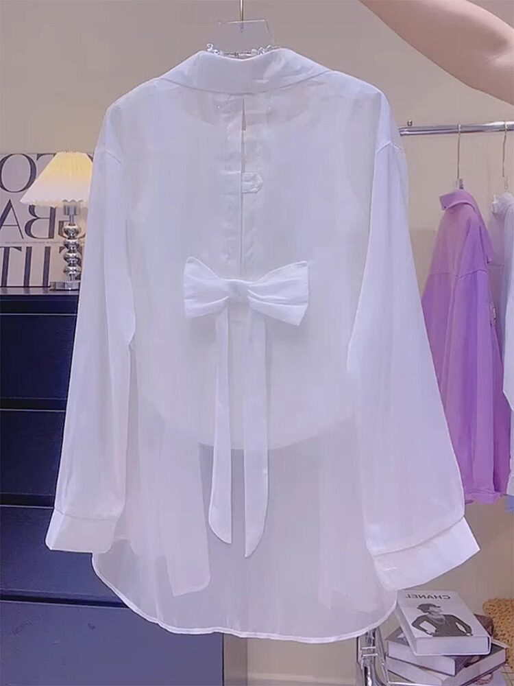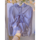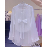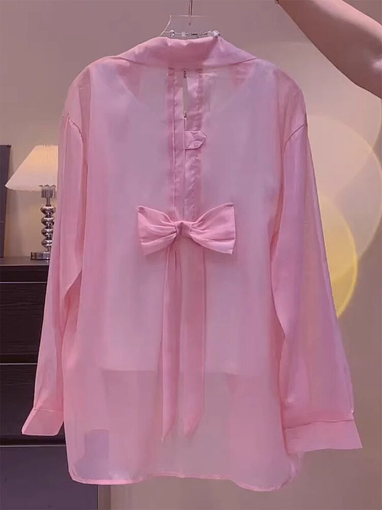 Дизайнерская летняя тонкая шифоновая рубашка с бантиком, тренд сезона, защита от солнца, воротник поло