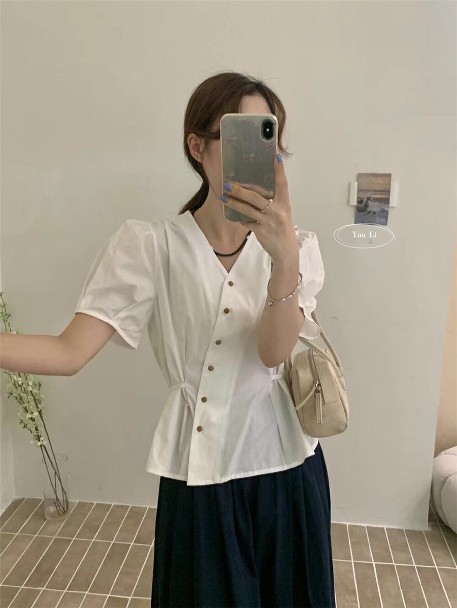 U-образная летняя минималистичная утягивающая рубашка на бретелях для женщин, 2024 г., хлопковая, приятная для кожи, темпераментная рубашка с V-образным вырезом и короткими рукавами