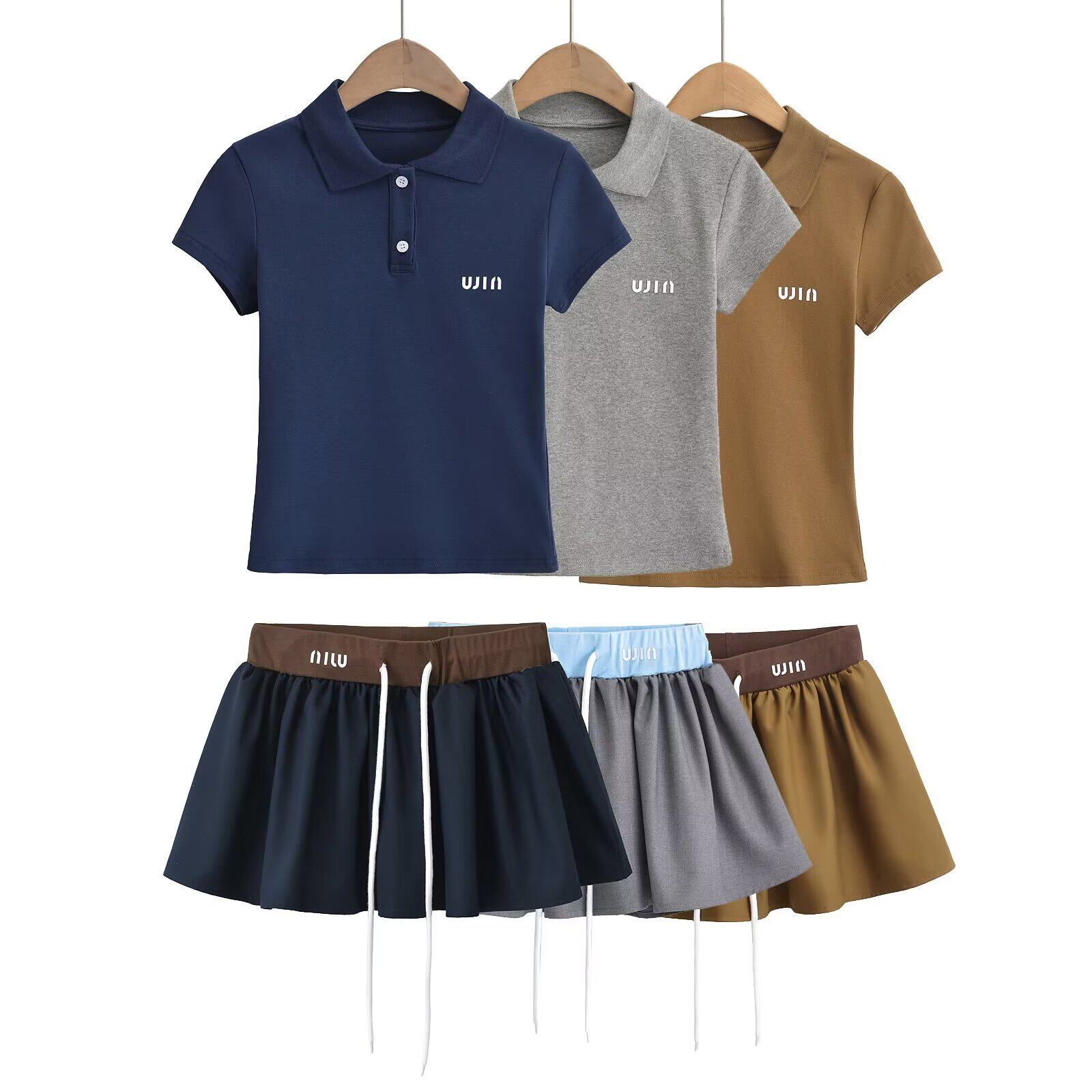 Футболка, мини-юбка, комплект, европейский стиль, воротник поло, высокая талия, на шнурках