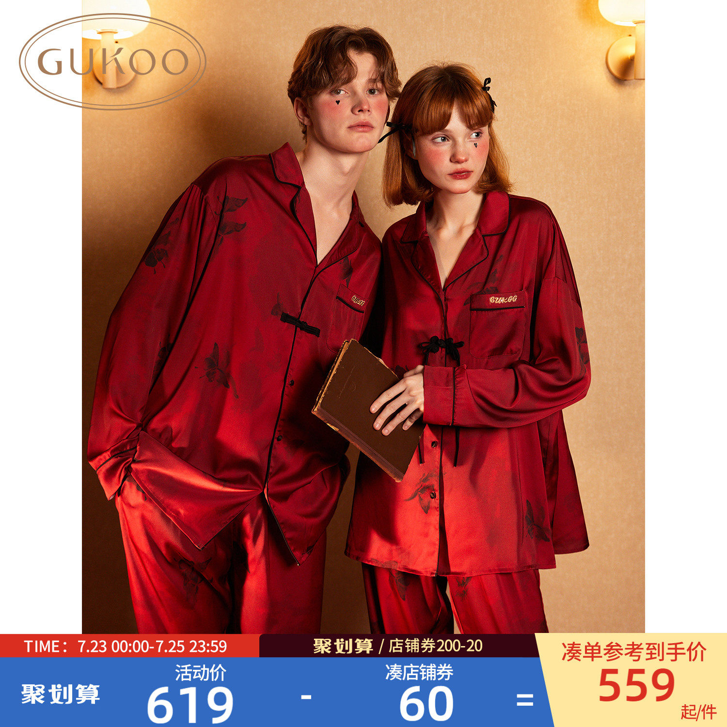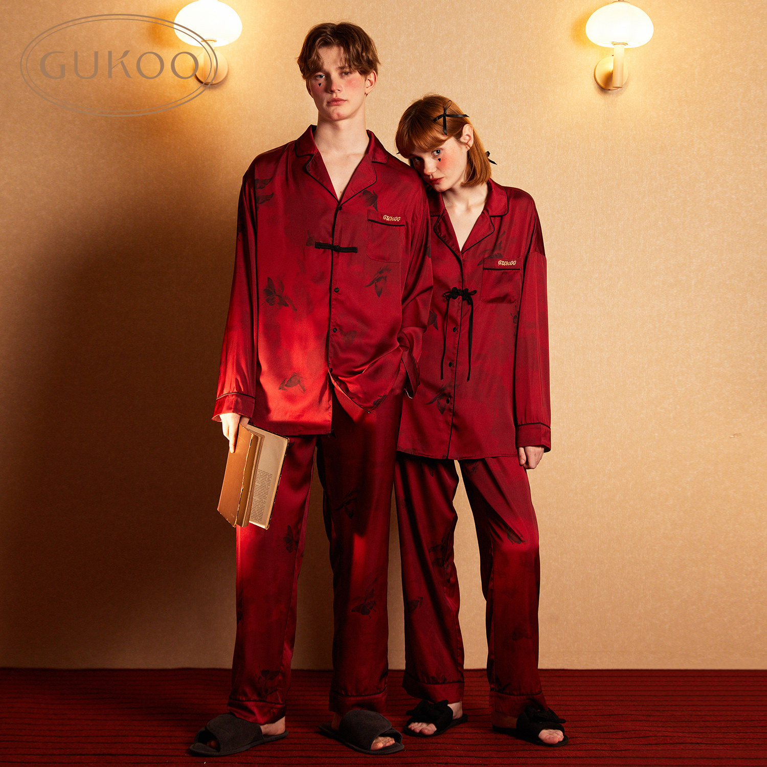 Gukoo/果壳 Осенняя пижама для влюбленных, красный шелковый комплект, китайский стиль